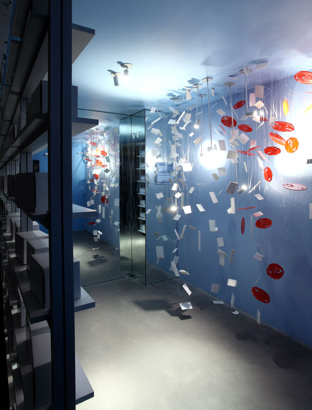 Los diferentes "celestes" de los símbolos patrios están presentes en las "banderas-cajas" que, a modo de instalación, están contenidas en un orden casual dentro de una