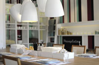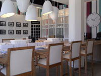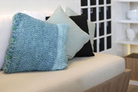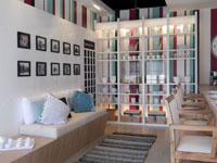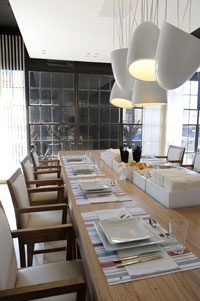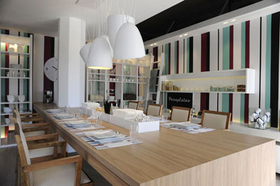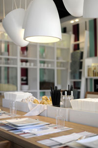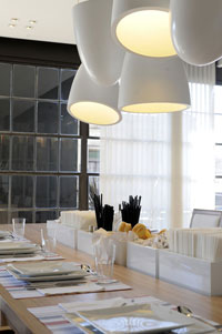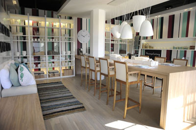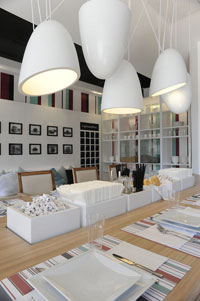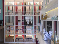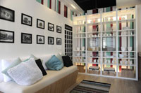 Las tramas en los tabiques, las telas y la iluminacion elegidas dan como resultado un ambiente en el cual