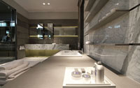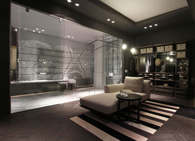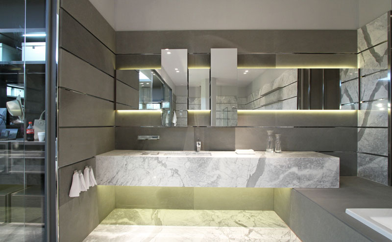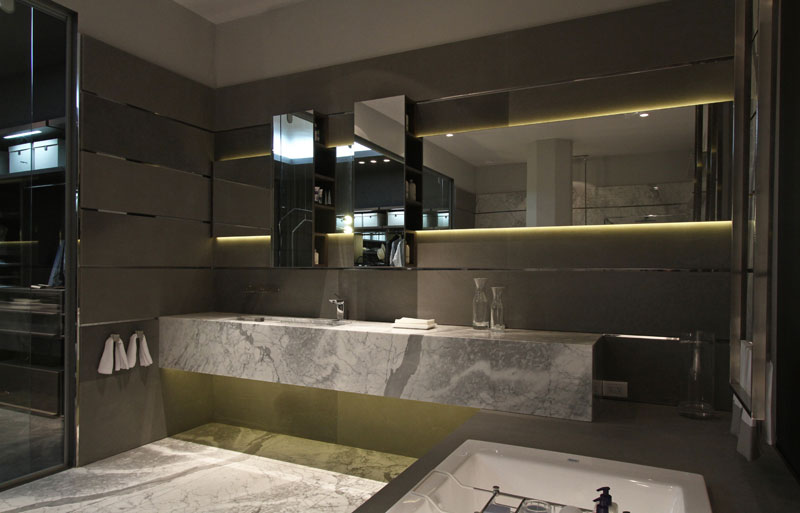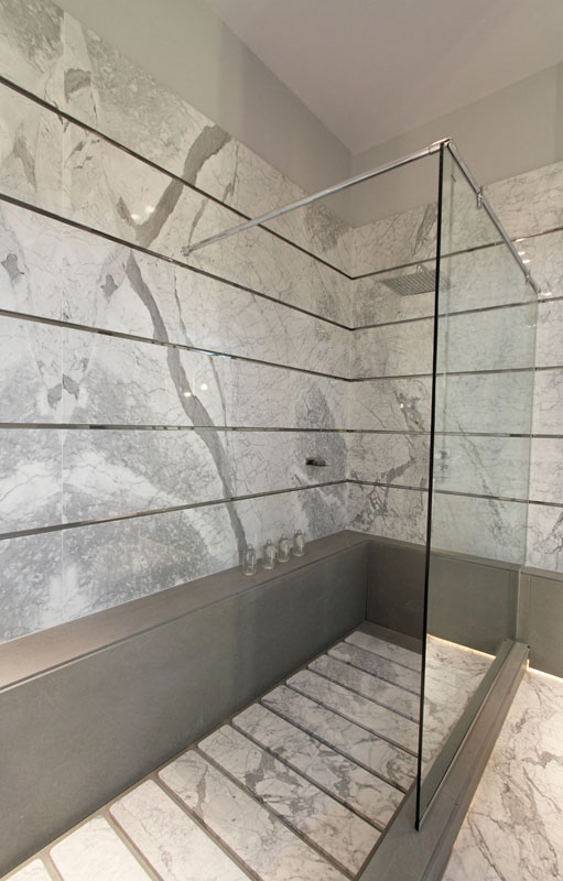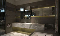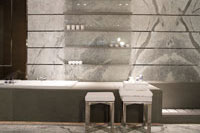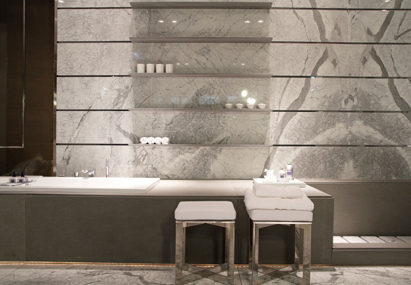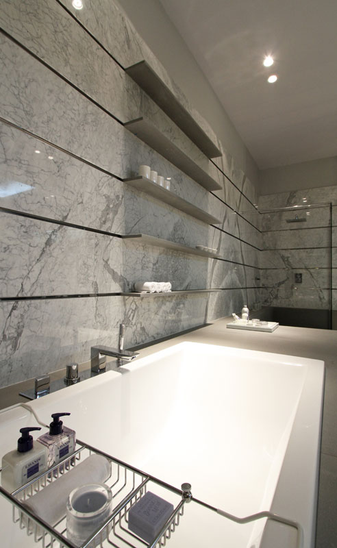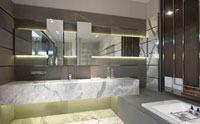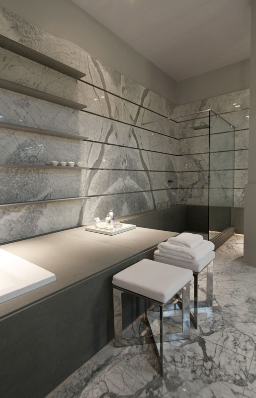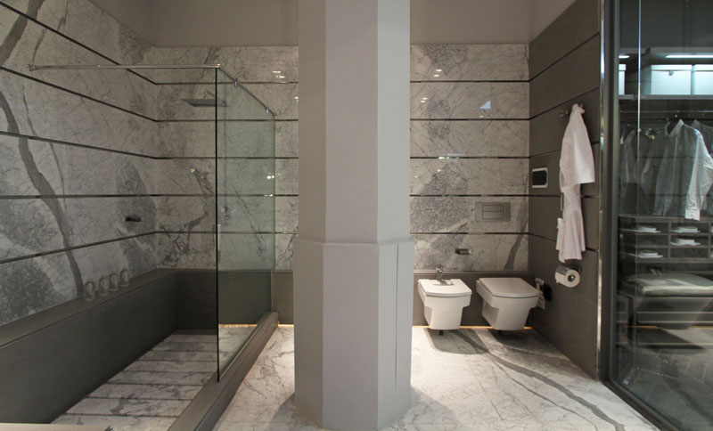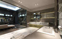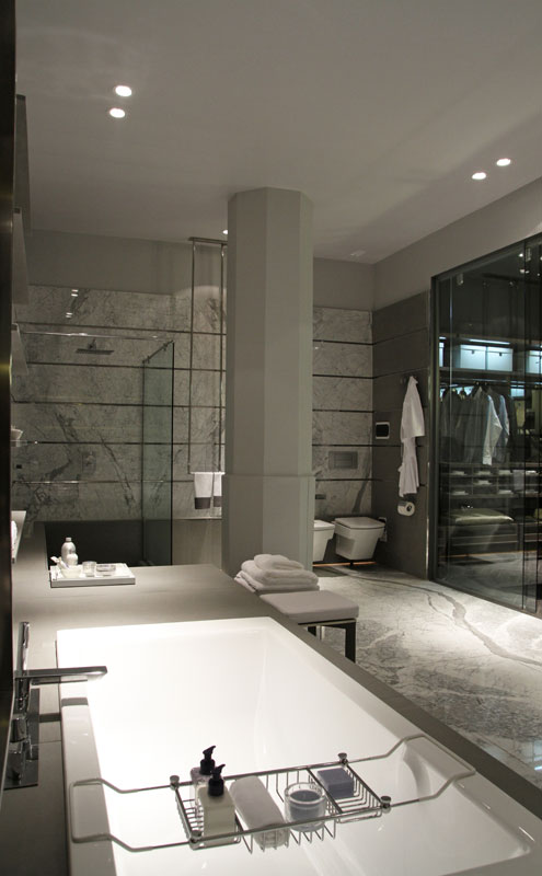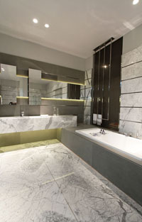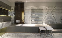 con una tarima de mármol que contiene la bañera y