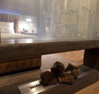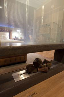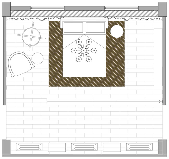 revestida en cemento Bomanite y en el centro un hogar