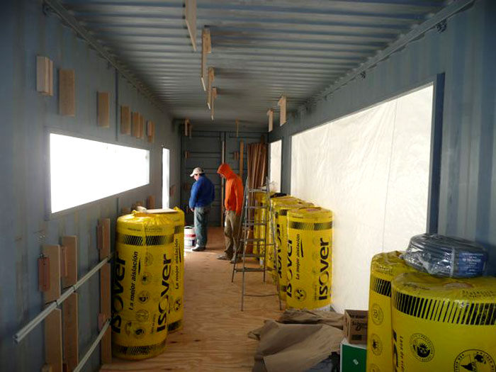 fieltro de lana de vidrio en los techos y 5 en los muros,