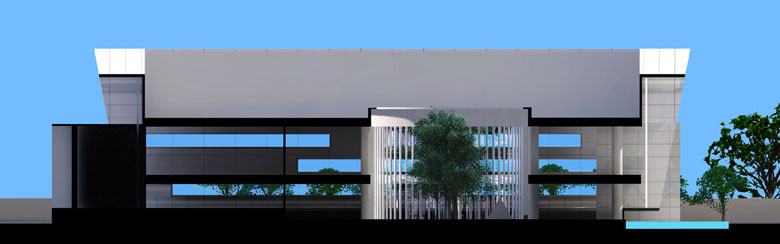 El frente tiene una gran mampara de vidrio reflectivo de carpintería