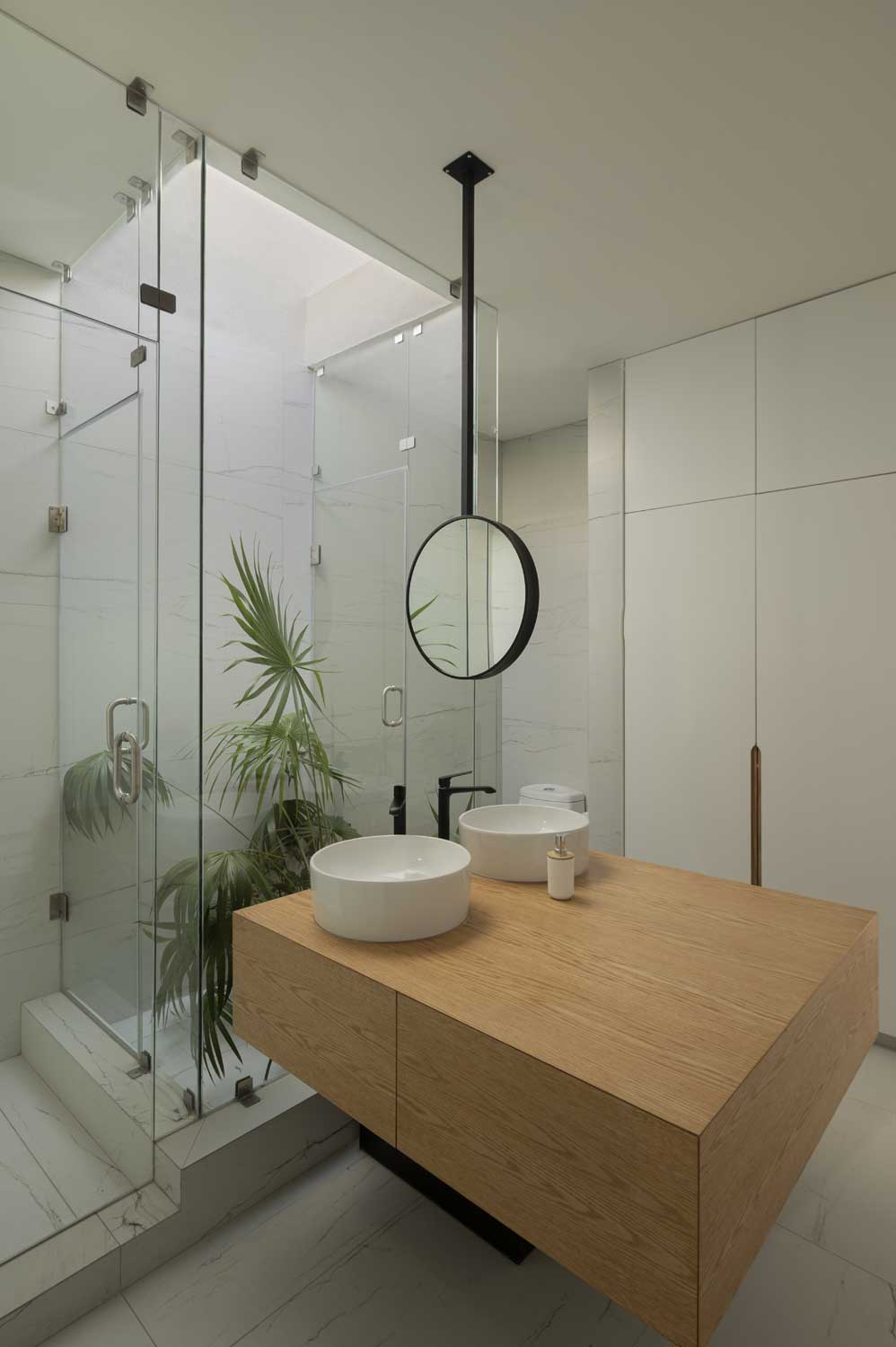 El diseño apuesta por un uso contenido de materiales, priorizando aquellos que transmiten calidez en los espacios sociales y privacidad en las áreas íntimas.