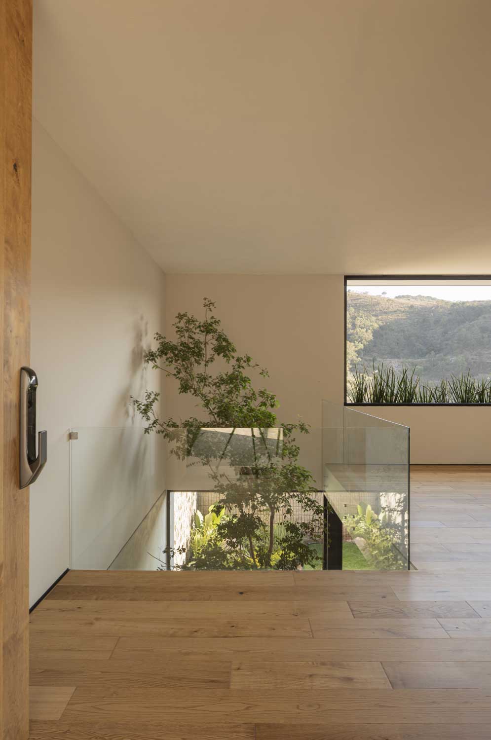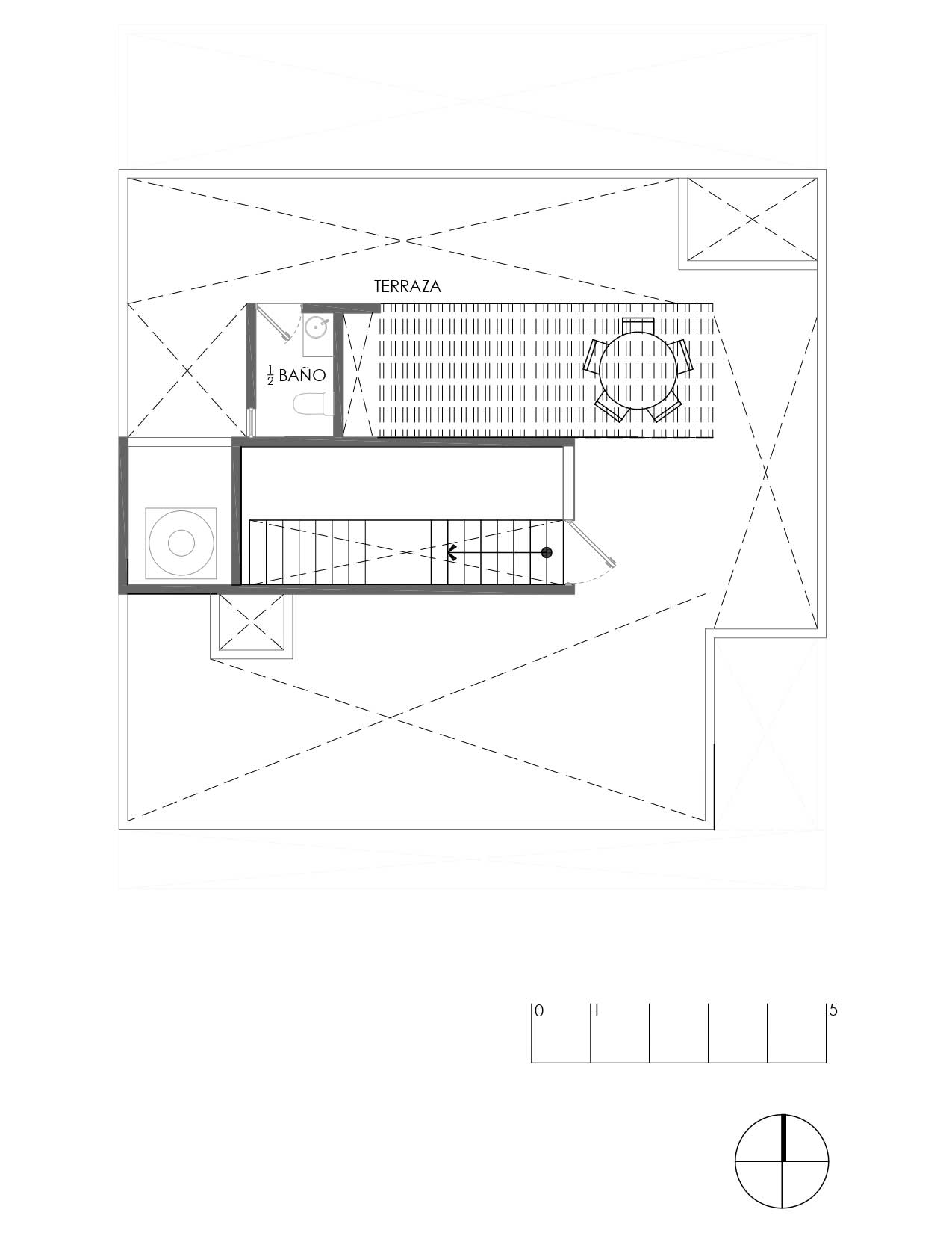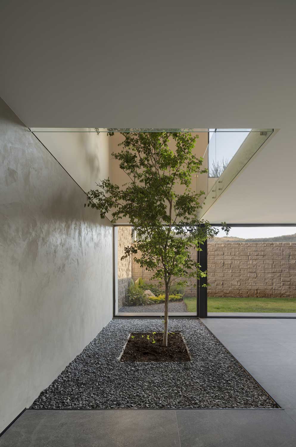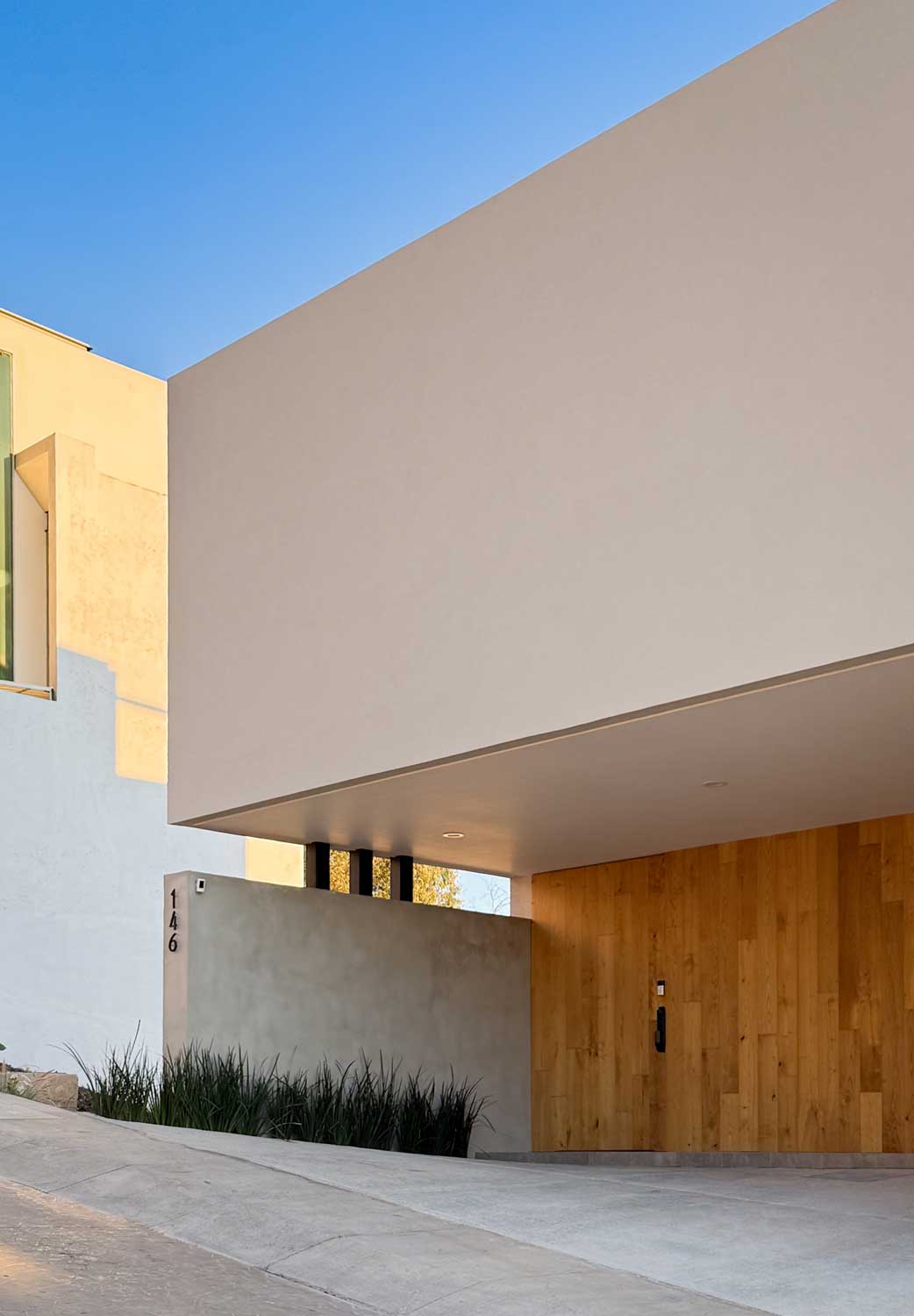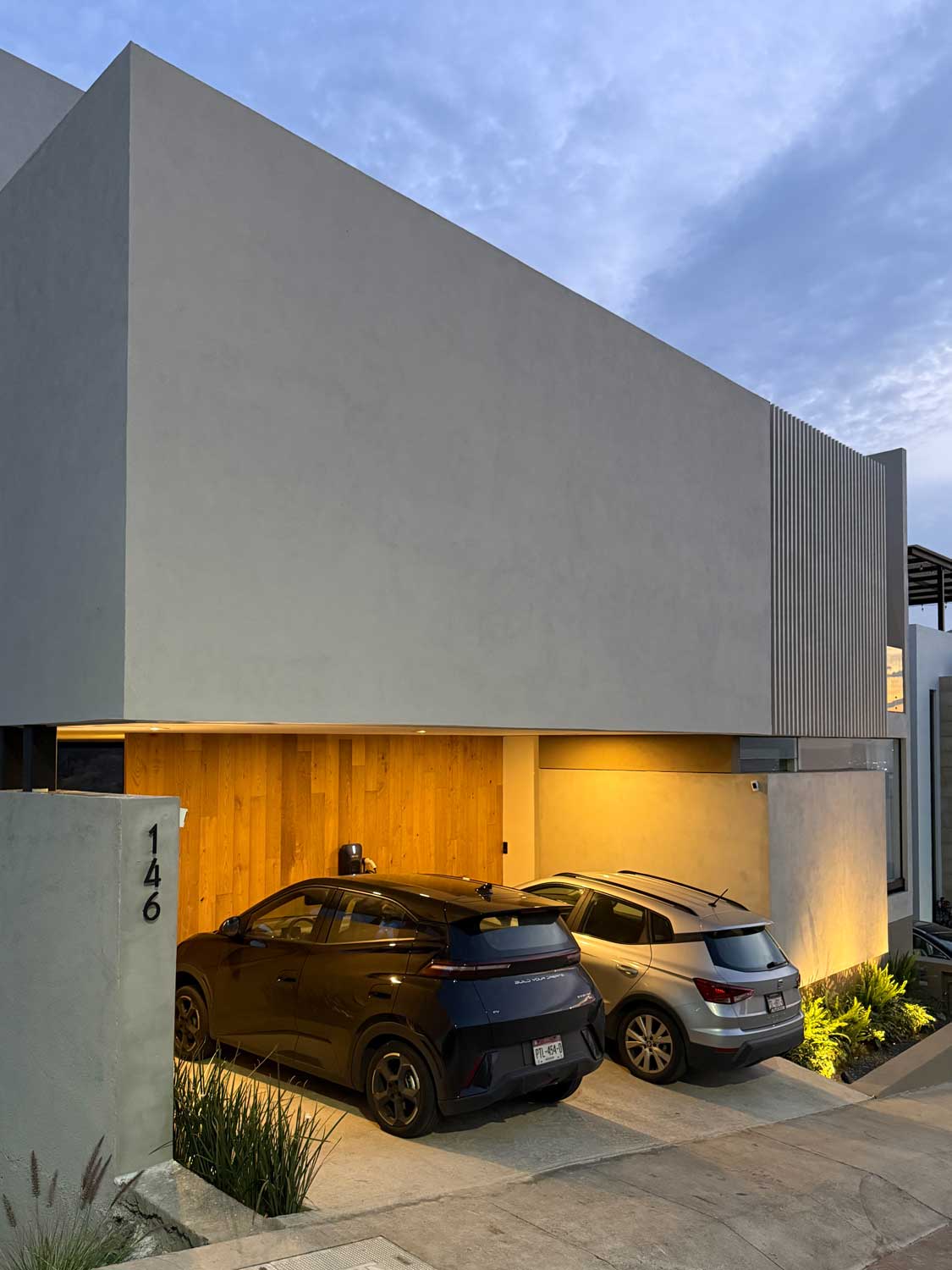 Hacia el exterior, la casa presenta una fachada sobria y cerrada, que invita al descubrimiento progresivo de sus interiores, protegiendo la privacidad y controlando deliberadamente las vistas desde adentro hacia afuera.