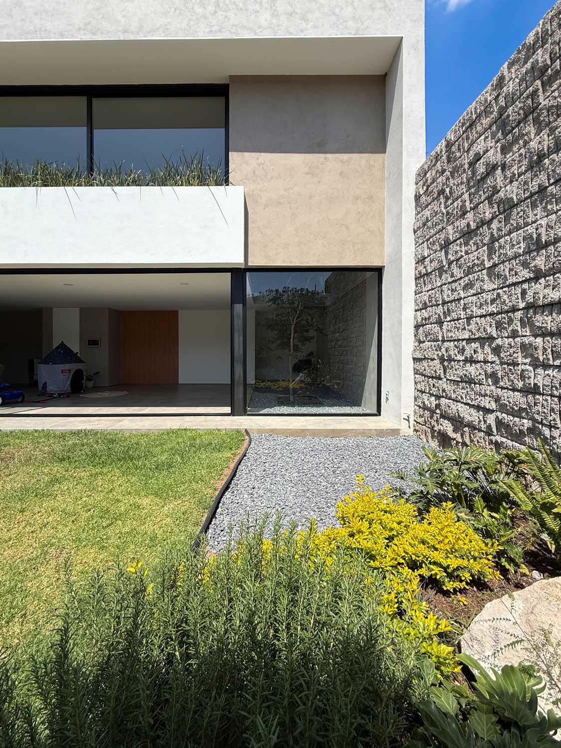 Desarrollada en un terreno regular de 12 metros de frente por 16 metros de fondo, con una pendiente descendente de 4 metros y orientación de fachada norte, el proyecto plantea una estrategia basada en grandes ventanales al sur, que permiten la entrada abundante de luz natural y generan una atmósfera cálida en el interior.