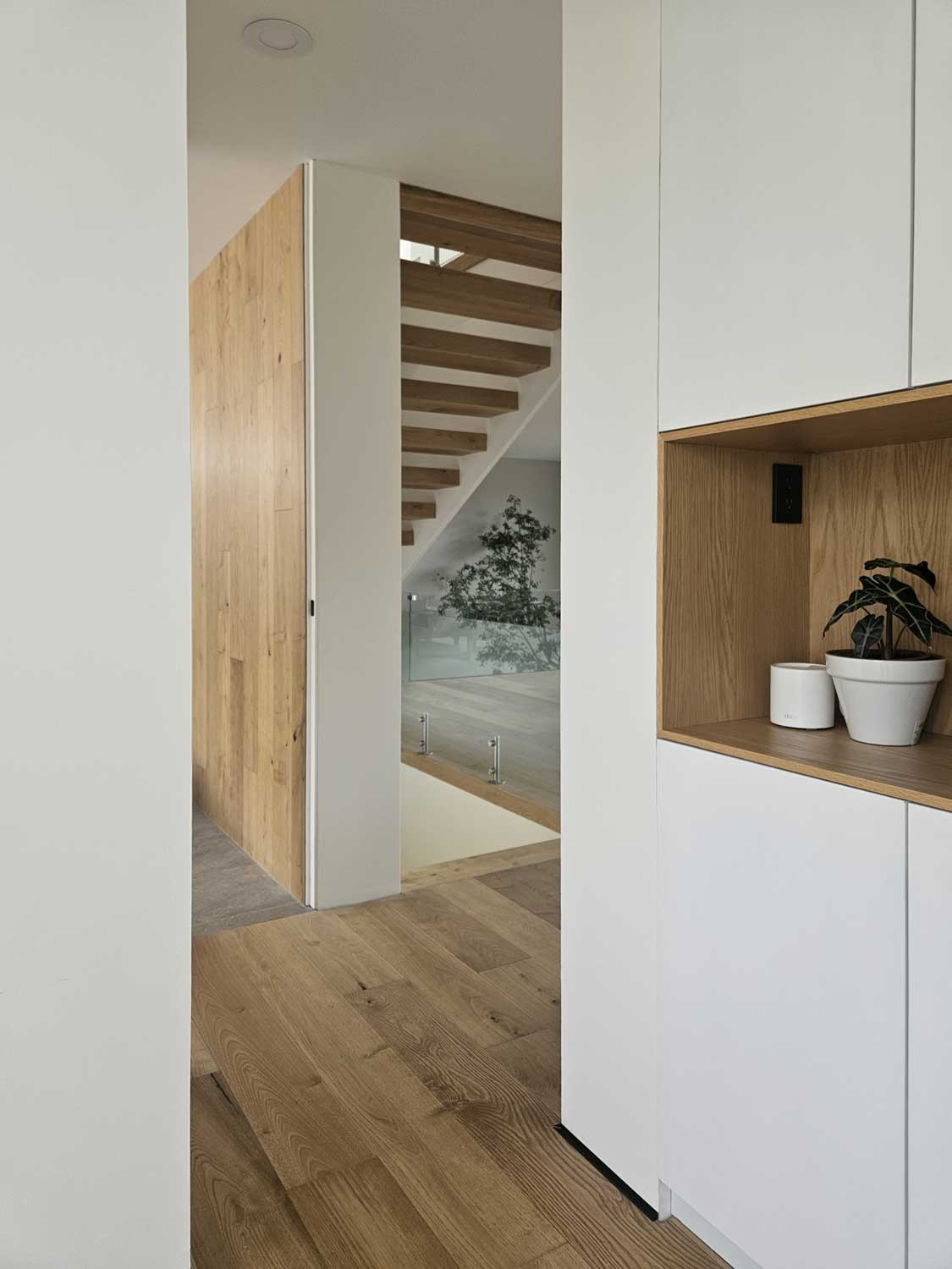 La escalera, como pieza protagónica y articuladora del proyecto, se concibe como un trazo ligero y esbelto: un barandal minimalista de herrería acompaña su recorrido, mientras los escalones, forrados en madera de ingeniería, mantienen continuidad en el material de pisos para reforzar la unidad espacial.