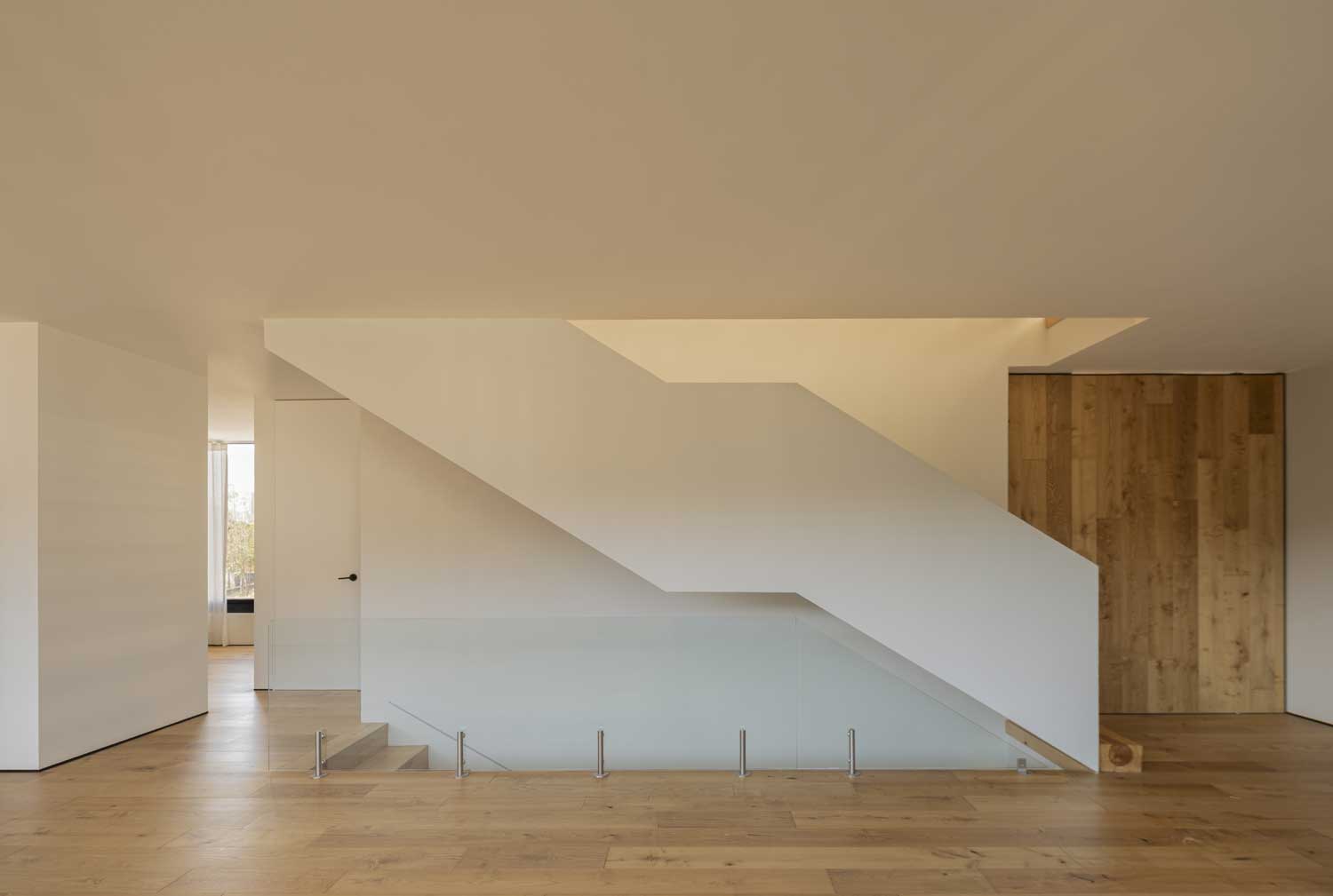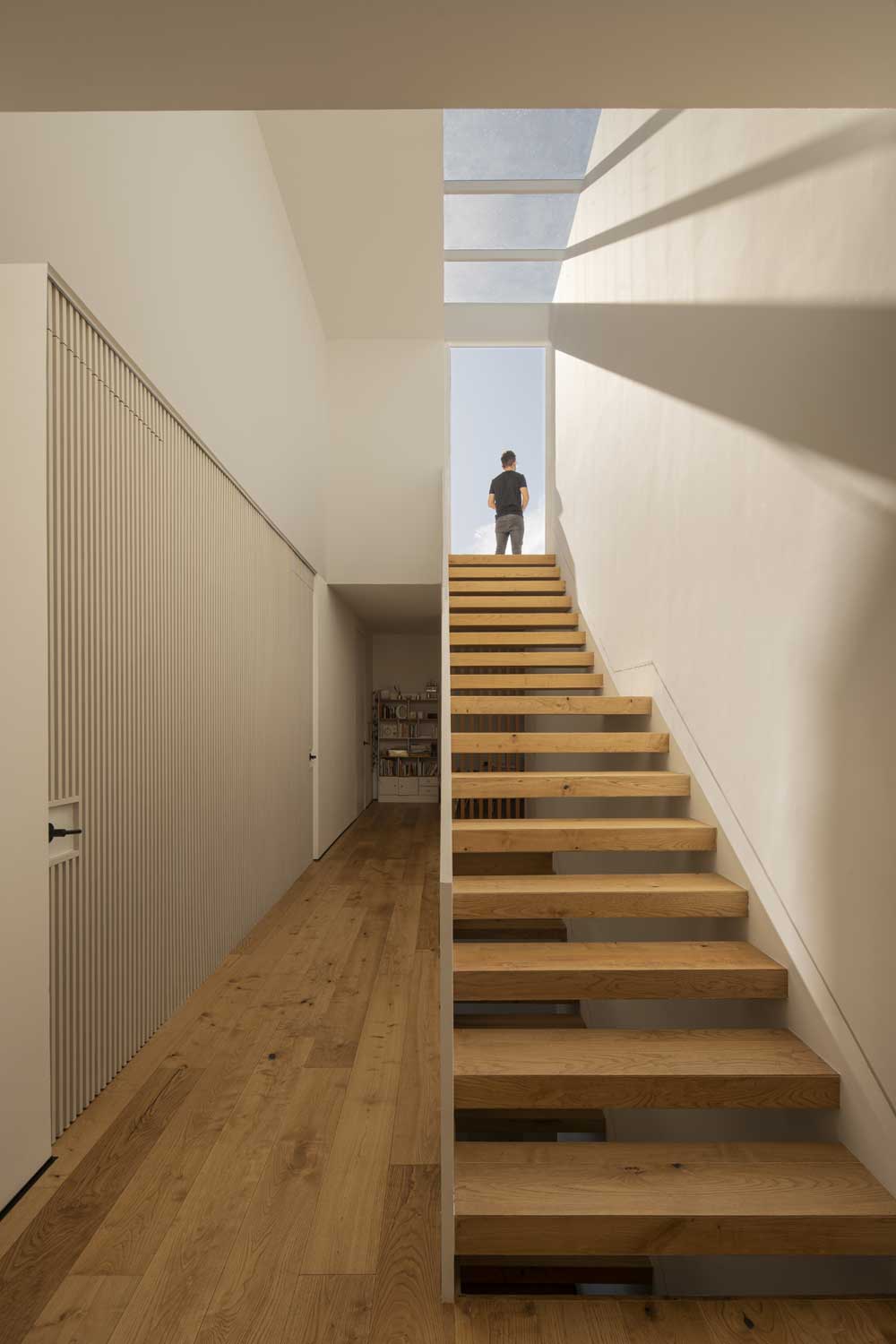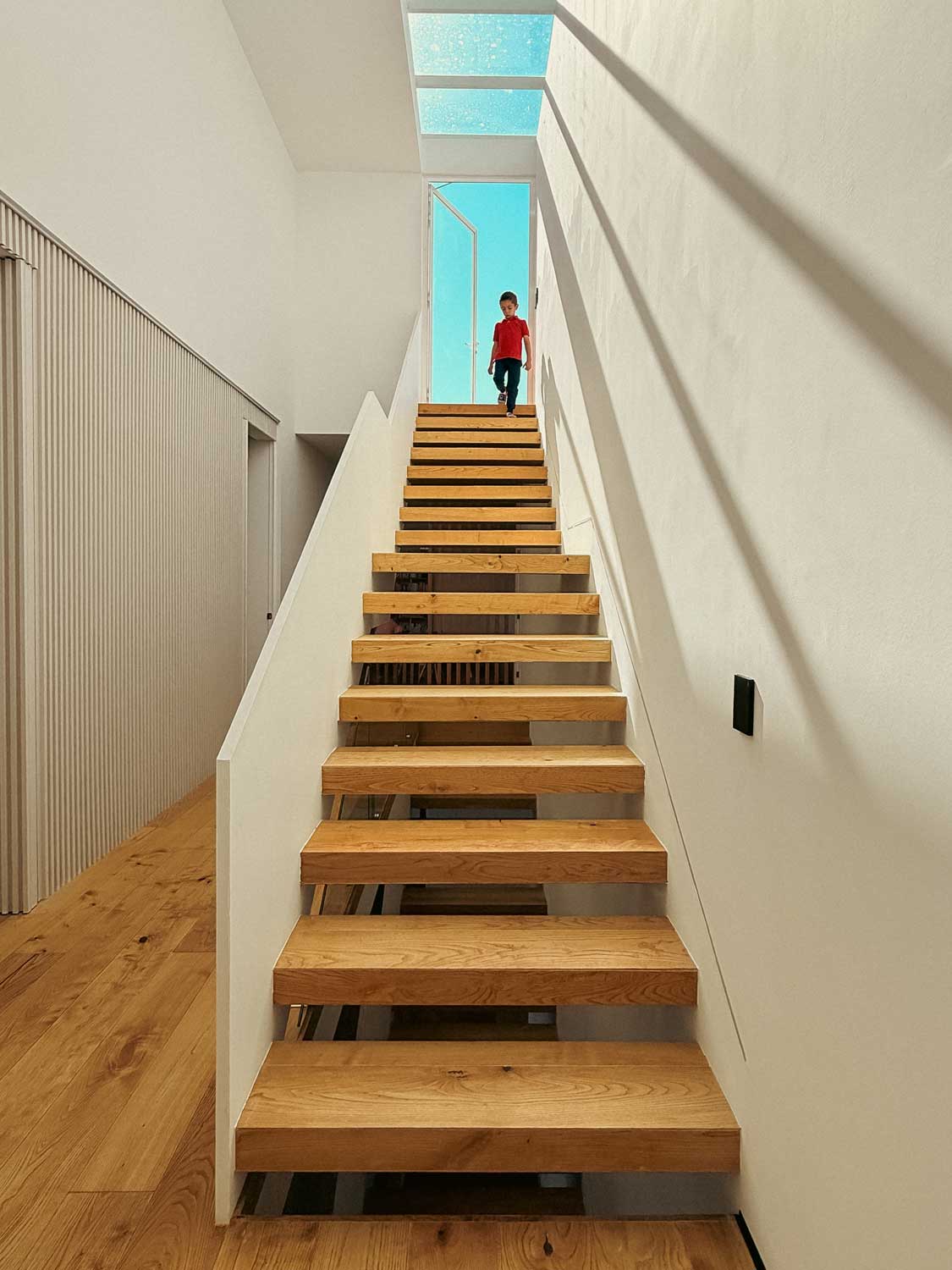 El eje vertebral de la circulación es una escalera recta que organiza la distribución de toda la vivienda, convirtiéndose en un elemento articulador de los espacios.