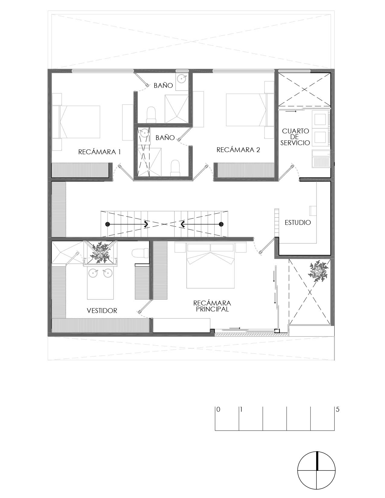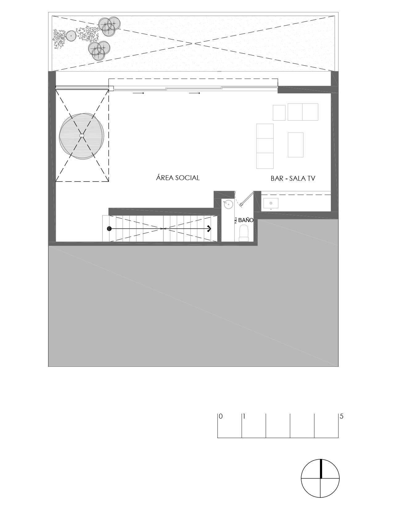 El acceso principal se da a nivel de planta baja, donde un árbol Arrayán actúa como remate visual, visible desde un nivel inferior en un espacio a doble altura. En este mismo nivel se desarrolla un área social de concepto abierto que integra sala, comedor y cocina en un solo ambiente, promoviendo la convivencia familiar diaria. También en esta planta se ubica una oficina con grandes ventanales que ofrecen iluminación natural privilegiada.