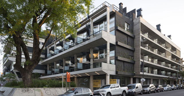 La posibilidad de relacionar al nuevo edificio con una pequeña plaza de escala barrial y un importante árbol centenario que es icono del barrio nos inspiró al desarrollo de un proyecto con una fuerte impronta doméstica, en el que cada unidad en dúplex aporta al dibujo de la fachada con una morfología que remite, en clave contemporánea, al carácter del tejido residencial de Coghlan, notable por su cantidad de casas de dos plantas con jardín al frente.