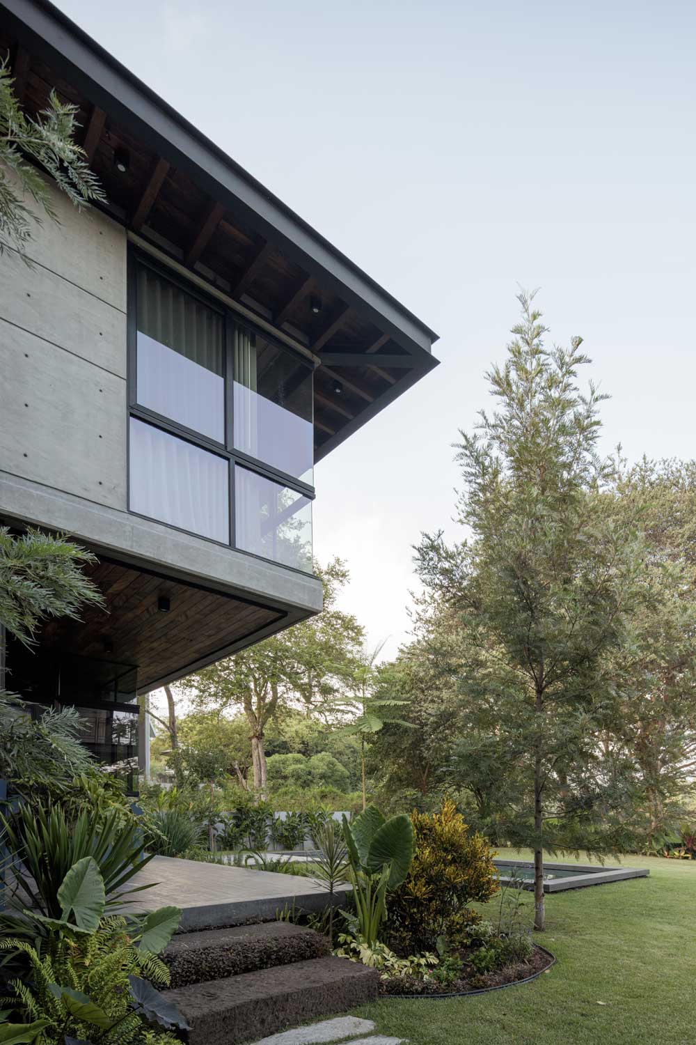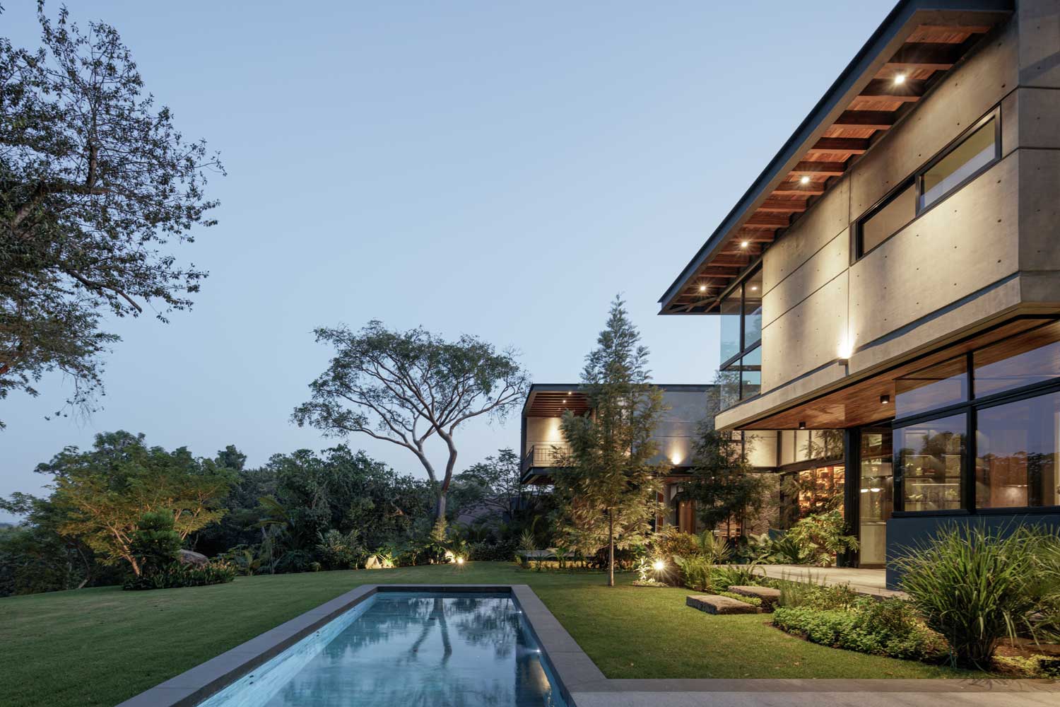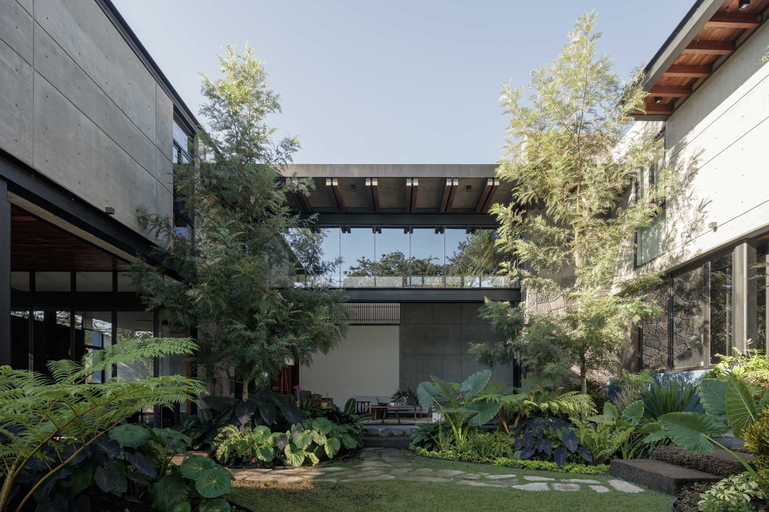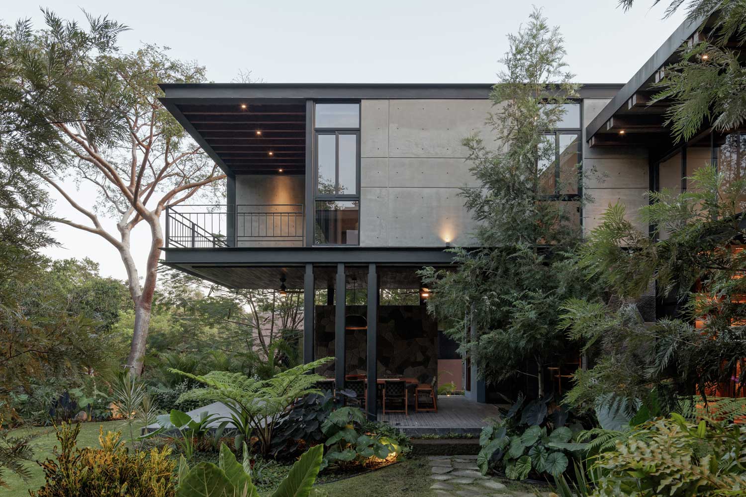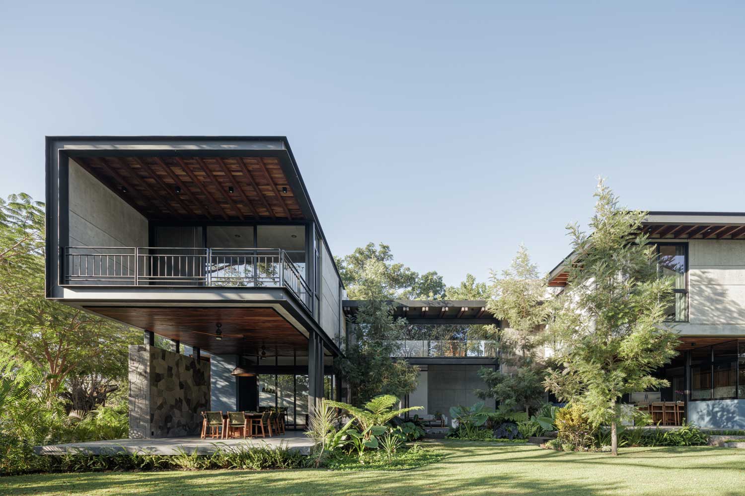 Casa Zazil (Residencial Altozano, Cuauhtémoc, Colima, México) por Di Frenna Arquitectos. Recorrer Casa Zazil evoca una variedad de sentimientos y sentidos. El viento que se pasea a través de la vegetación suscitando sonidos, las texturas en la materialidad, la rugosidad de la piedra, la variedad de tonalidades y olores que regalan las vetas en la madera; caminar la casa desde el ingreso despierta continuamente en los usuarios la curiosidad por descubrir lo que se vivirá en el siguiente espacio.