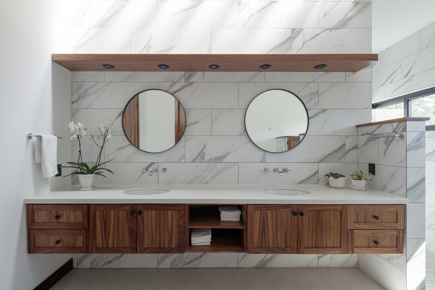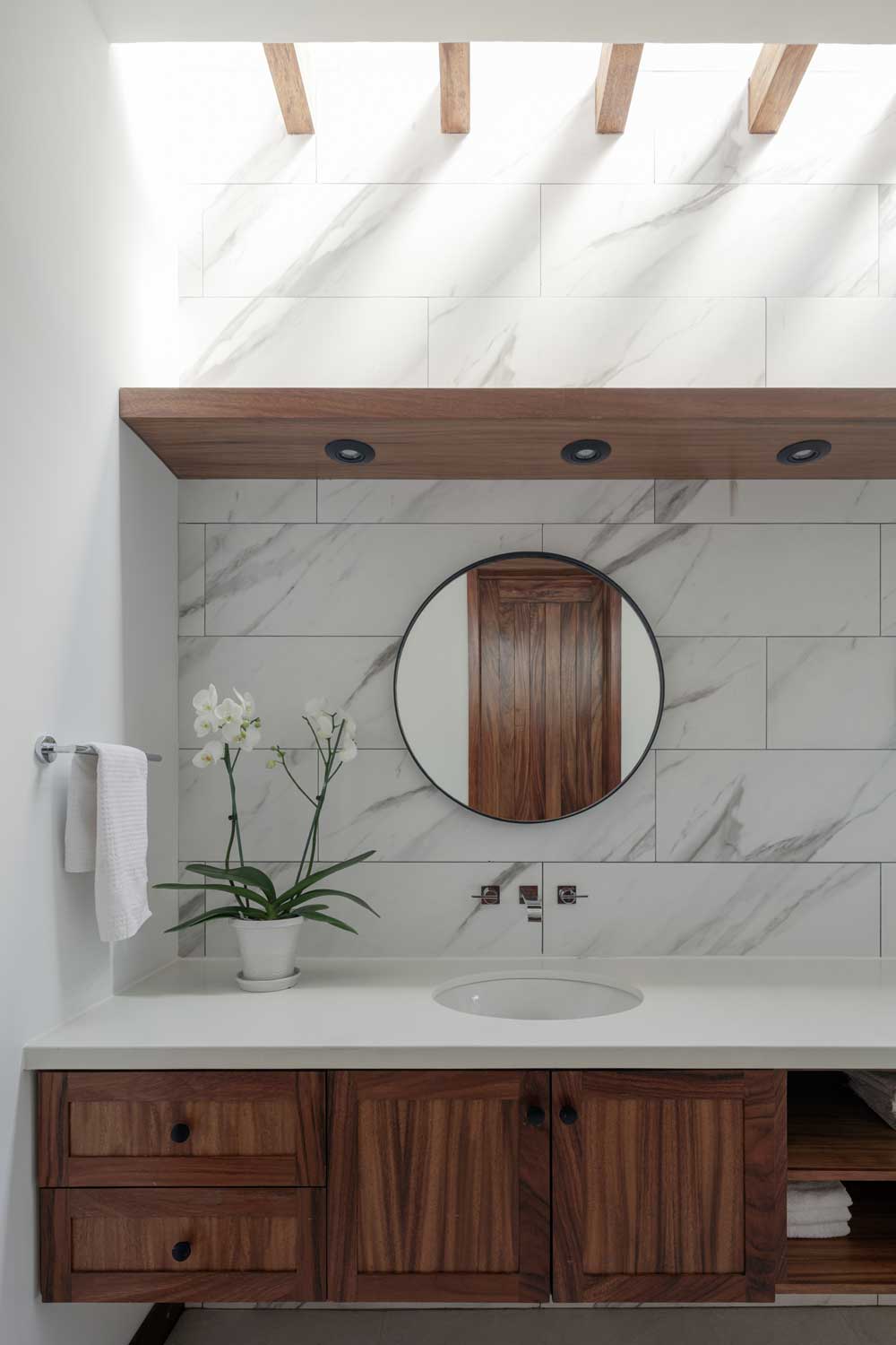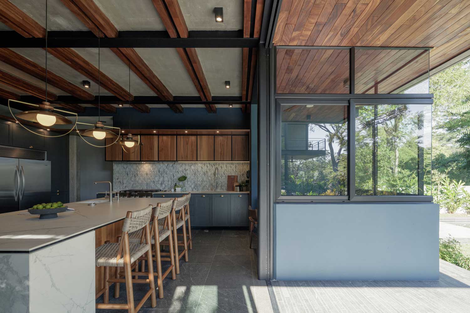 El nivel superior alberga las habitaciones, la calidez se vive en esta planta, los elementos de carpintería se sienten fundamentales y las pausas que se insinúan a través de las ventanas, son un deleite de iluminación natural que admiten las magníficas vistas a las copas de los árboles y al horizonte.