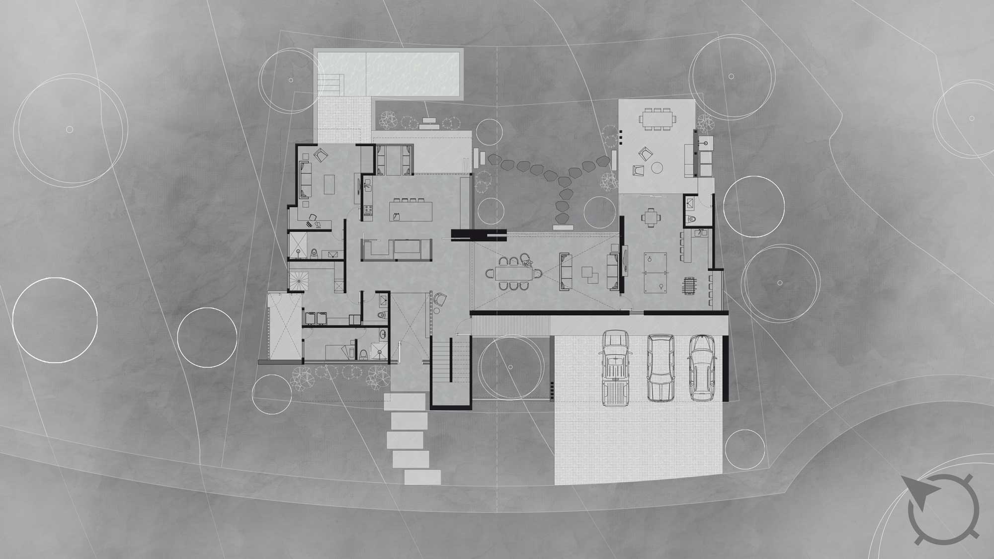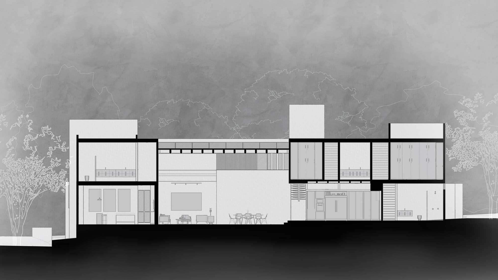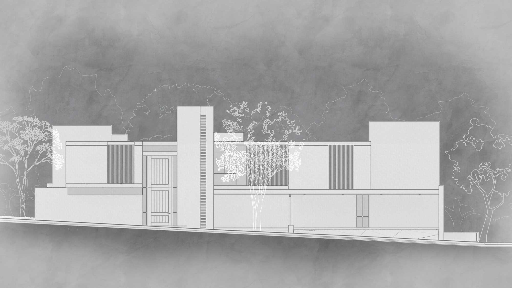 El proyecto se desplanta en forma de herradura como un gesto de cobijo para quienes la habitan; protege del clima y asoleamiento colimense, mientras busca la privacidad y contiene el programa arquitectónico de forma ordenada generando un contexto íntimo que se abre y contradice a este mismo principio en su fachada posterior.