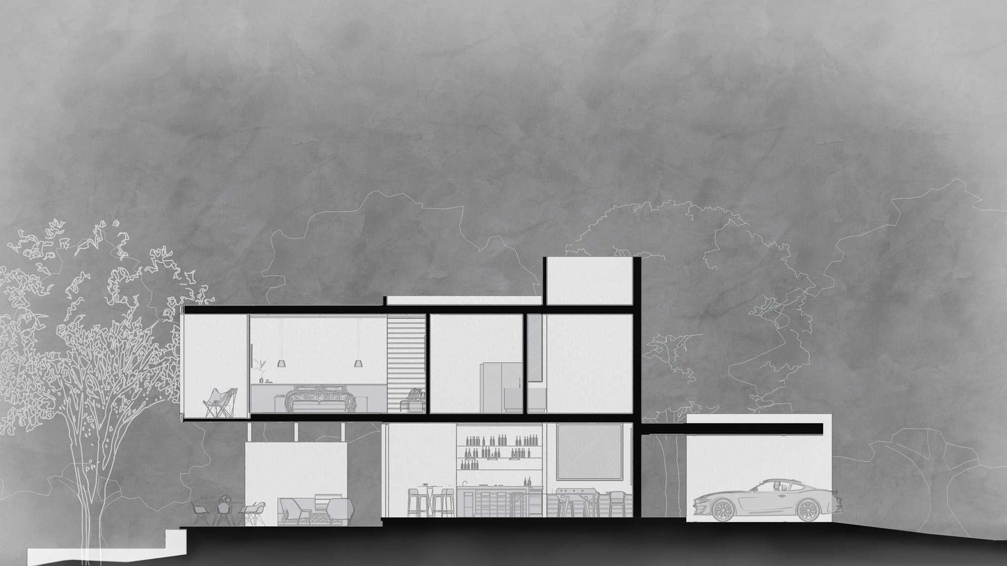 El programa se divide en dos acentuados volúmenes y plantas, donde la zonificación se volvió clara y precisa. Los espacios sociales se resguardan en el primer nivel y se gratifican con la vista al campo de golf junto con la extensión de la vegetación aledaña que parece integrarse sutilmente a los huecos que la misma va encontrando al dispersarse. Es así como un gigantesco árbol de papelillo se integra perfectamente a la residencia y destaca sin dejar de mimetizarse con el resto de las plantas.