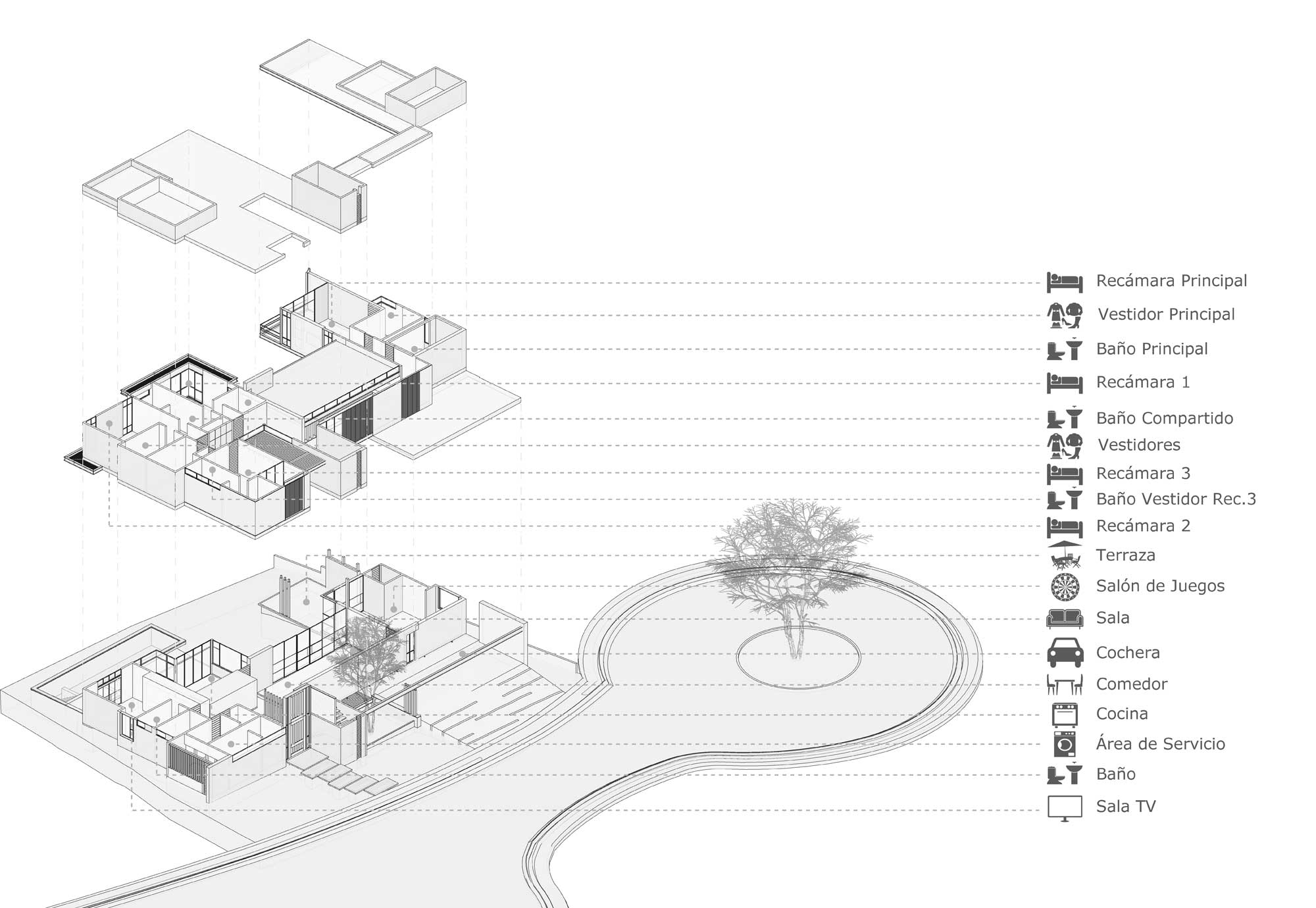 La relevancia entre los diferentes espacios toma lugar gracias a la variedad de alturas construidas, las cuales advierten cuando una zona quiere ser más acogedora y personal o cuando la intención es contraria y de índole más social. Así es como comienza el recorrido por la casa, un vestíbulo con doble altura recibe a los usuarios enmarcando un plano más corto y próximo para ceder la oportunidad de relevar una a una las siguientes habitaciones .