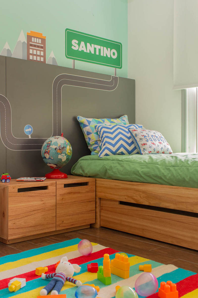 Para la habitación de Valentino (año 2014, 3 años en ese momento, hoy 6 años), el mayor de los hermanos, se mantuvo una temática basada en la ciudad con la idea principal de estar en su auto y jugar allí antes de ir a dormir.