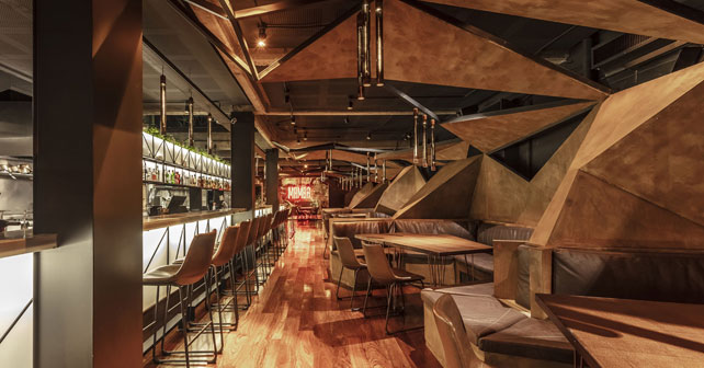 Mamba Bar (Ciudad de Buenos Aires, Argentina) por Hitzig Militello Arquitectos. El diseño tuvo como punto de partida la propuesta culinaria basada en un concepto gastronómico disruptivo (palabras propias del cliente). Entendimos que la búsqueda era exacerbar los sentidos, la fusión de sabores, los olores que convocan y las miradas que seducen. La idea fue potenciar la propuesta culinaria materializado a través un paisaje onírico y sugerente que acompañe el gran desafío gastronómico al cual nos han convocado.