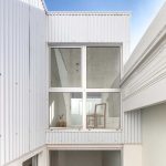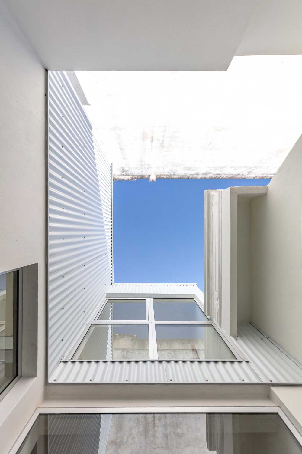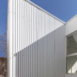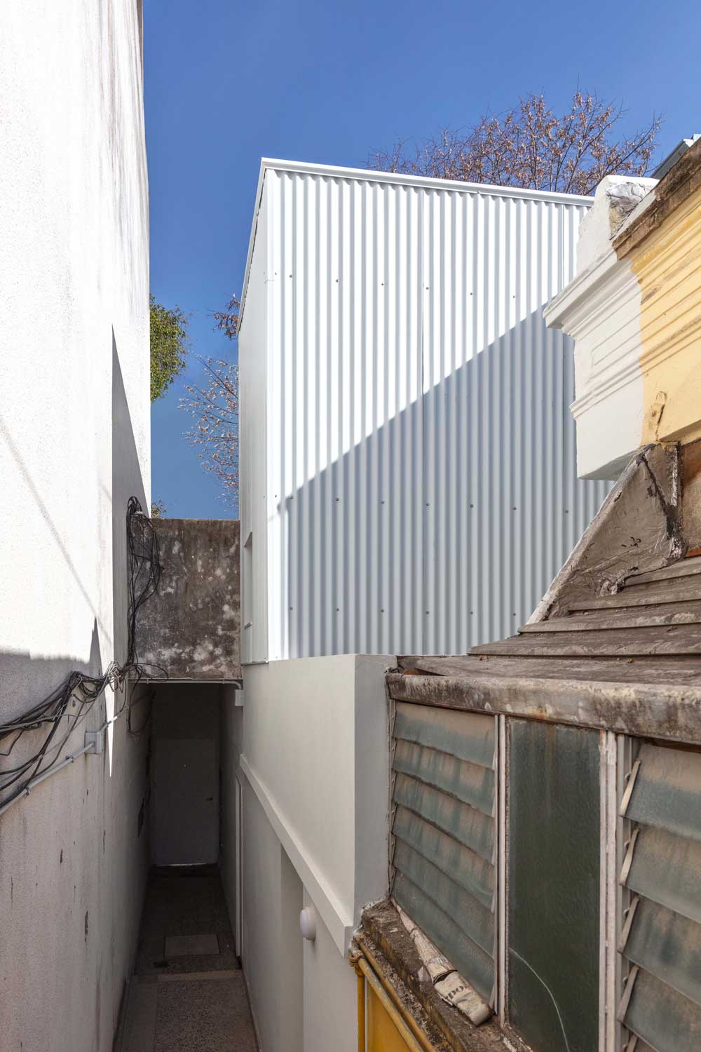 La fachada de la ampliación se resuelve con chapa acanalada blanca, lo que mantiene una continuidad cromática con la planta baja, a la vez que pone en evidencia la coexistencia de dos sistemas constructivos distintos.