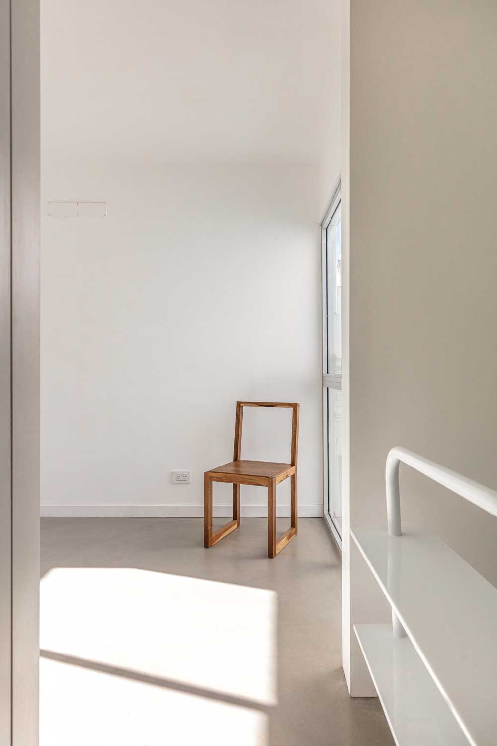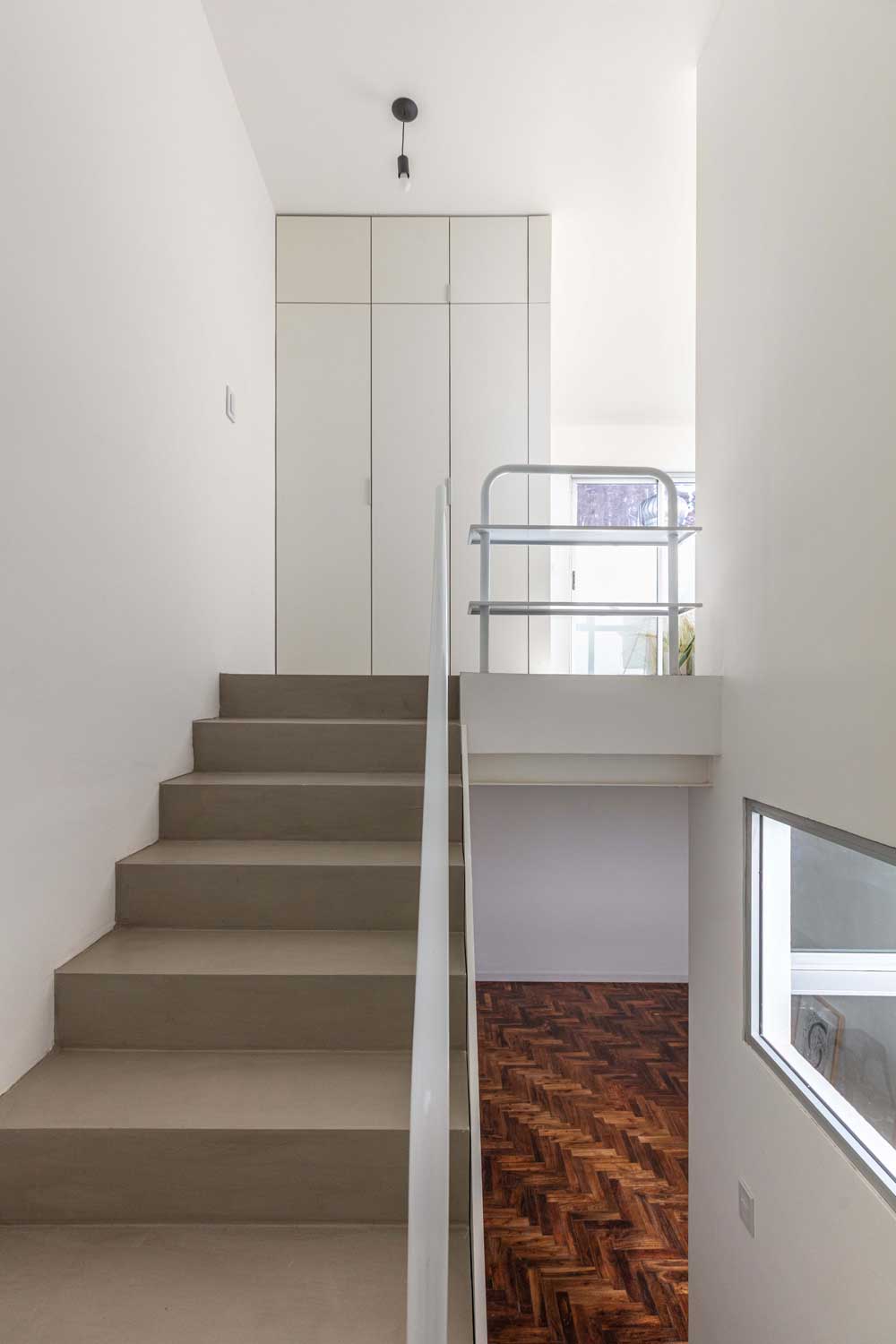 Ambos espacios se vinculan por una escalera que funciona también como un dispositivo para captar luz y ordenar las visuales.