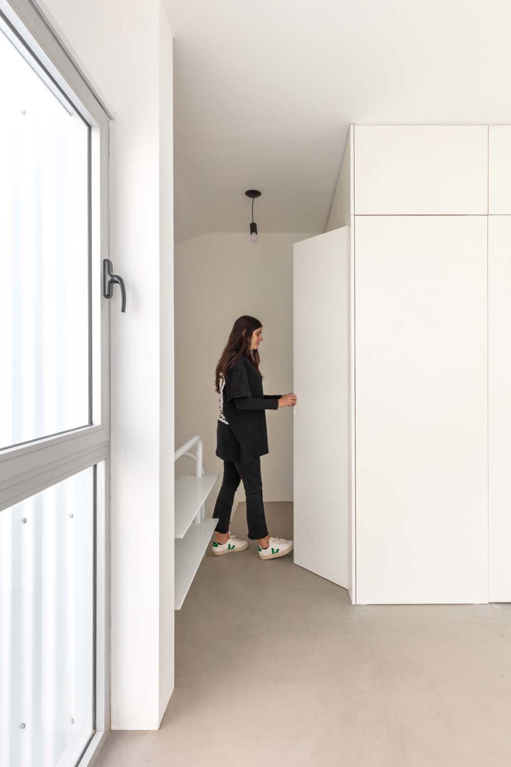 A very limited palette of materials was used, prioritizing the continuity of the white walls and gray floors. This creates a neutral base that favors the reflection and distribution of natural light throughout the home.