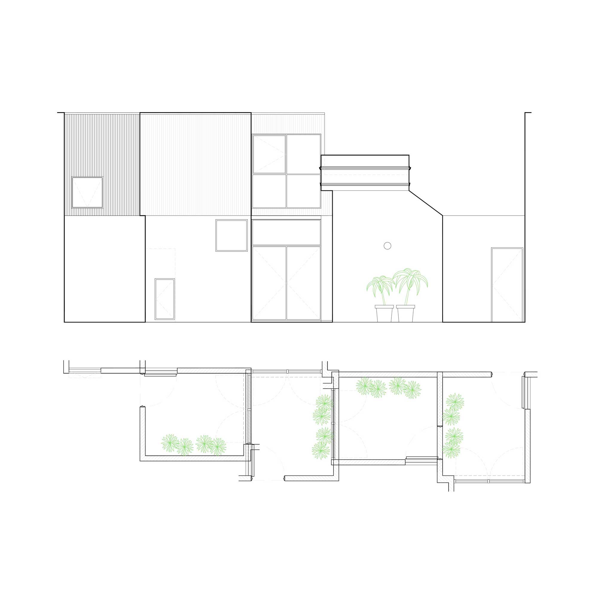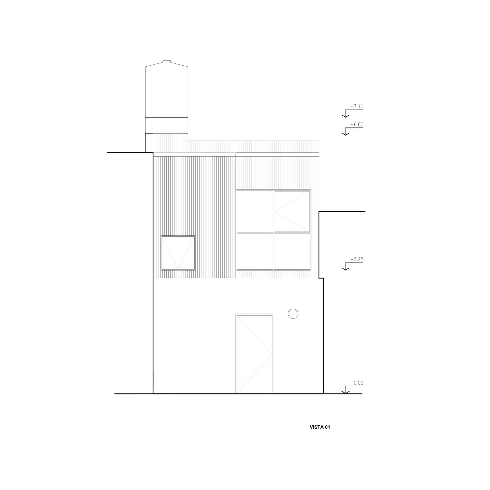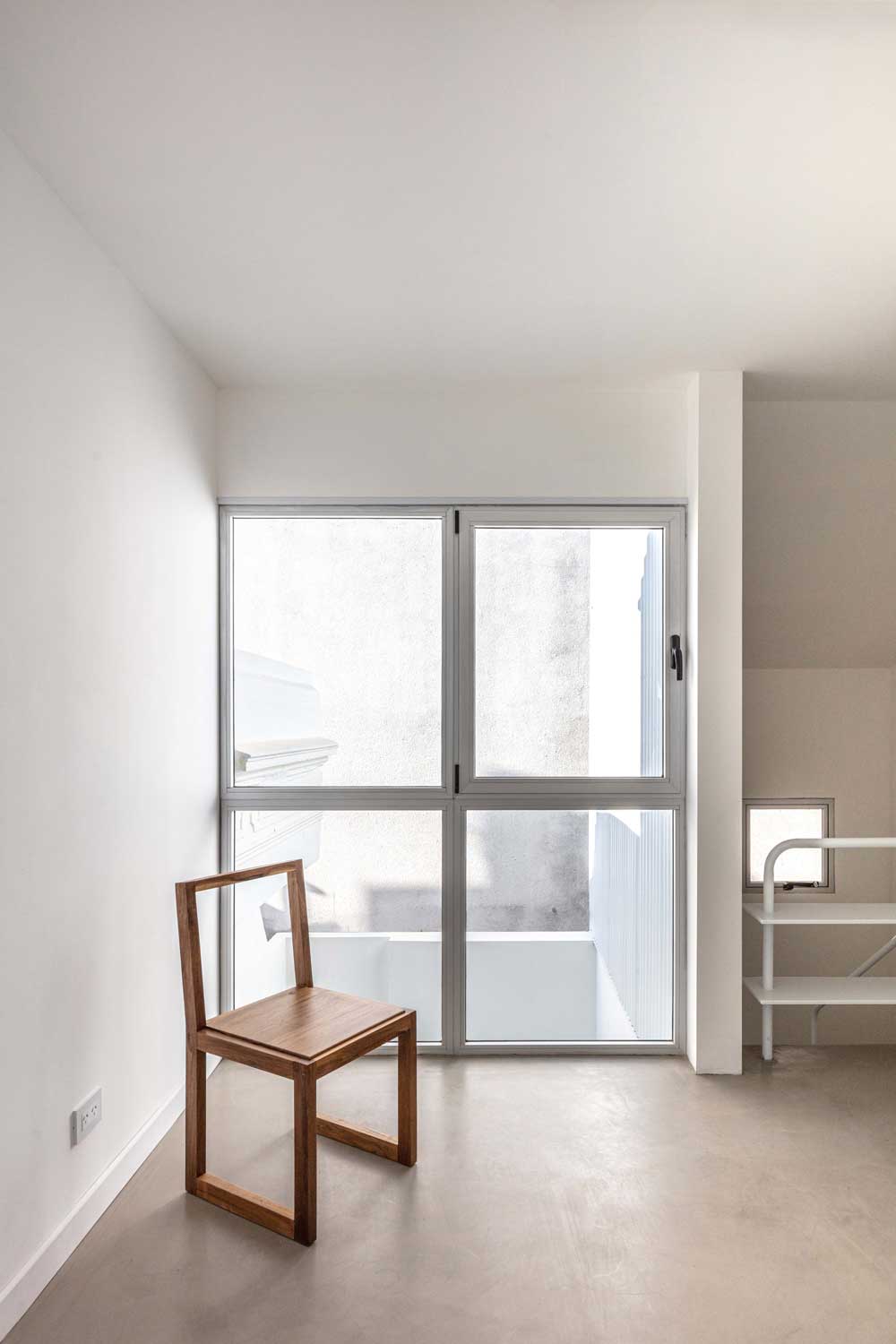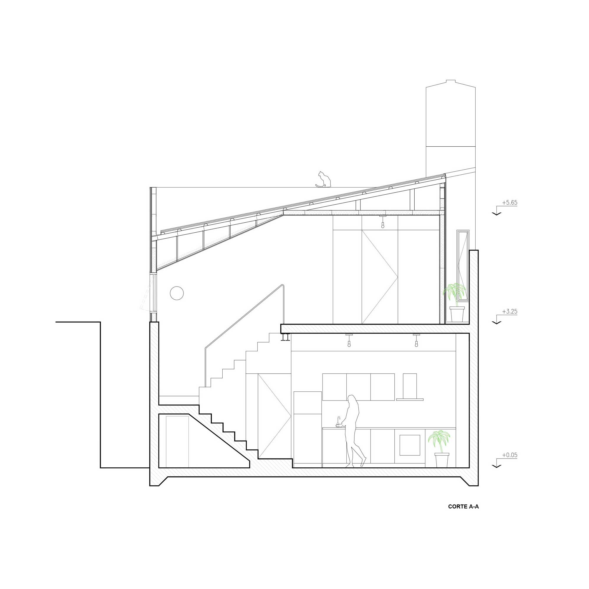 Como operación principal, se decide trasladar el dormitorio a una nueva planta alta, lo que le permite emerger por sobre las viviendas vecinas y acceder tanto a luz natural como a ventilación directa.