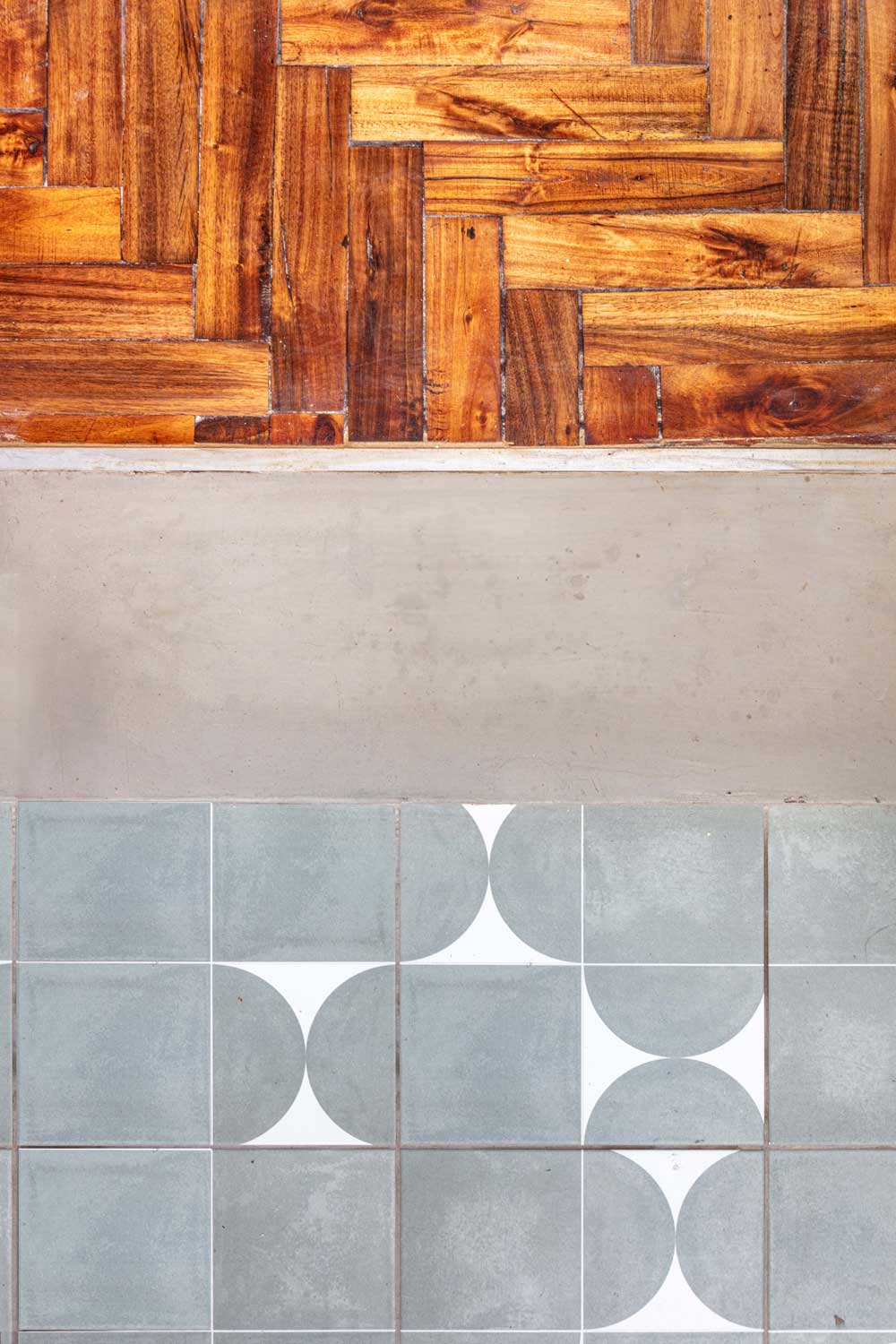 Se trabajó con una paleta de materiales muy reducida, priorizando la continuidad de los muros blancos y los pisos grises. Esto genera una base neutra que favorece la reflexión y distribución de la luz natural a lo largo de toda la vivienda.