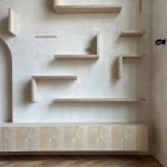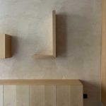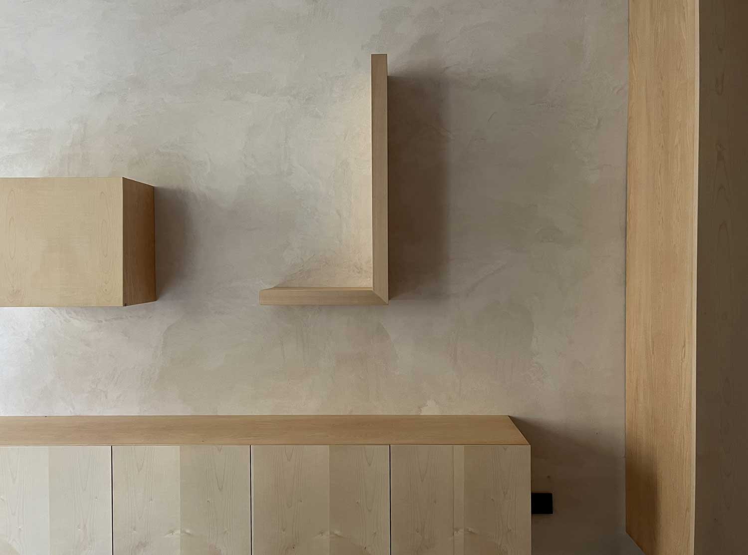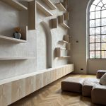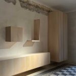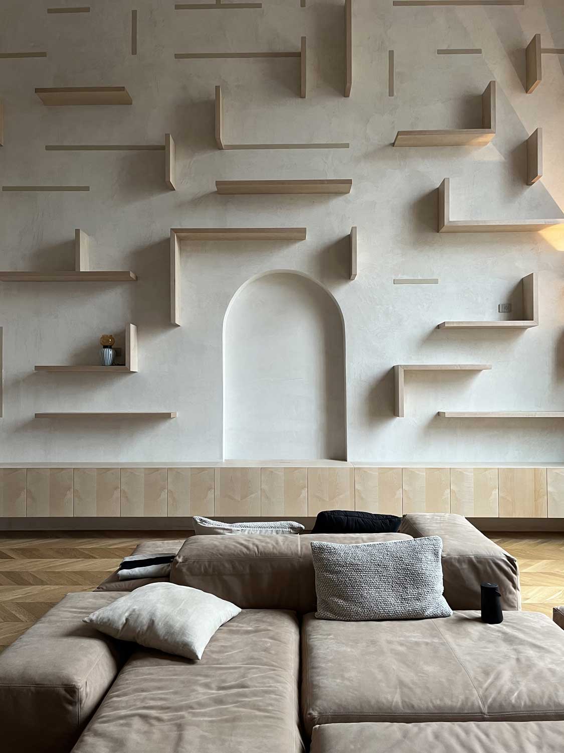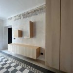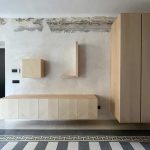 – Se retira la boiserie negra que cubría completamente la habitación y se vuelve a sacar a la luz la estructura original de ladrillo en una pared, mientras que algunos módulos de mobiliario de madera de arce, suspendidos en la pared, anticipan la disposición del diseño de la biblioteca del salón.