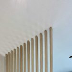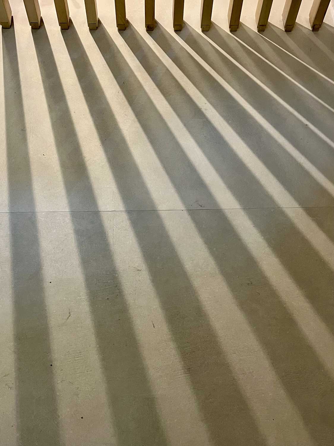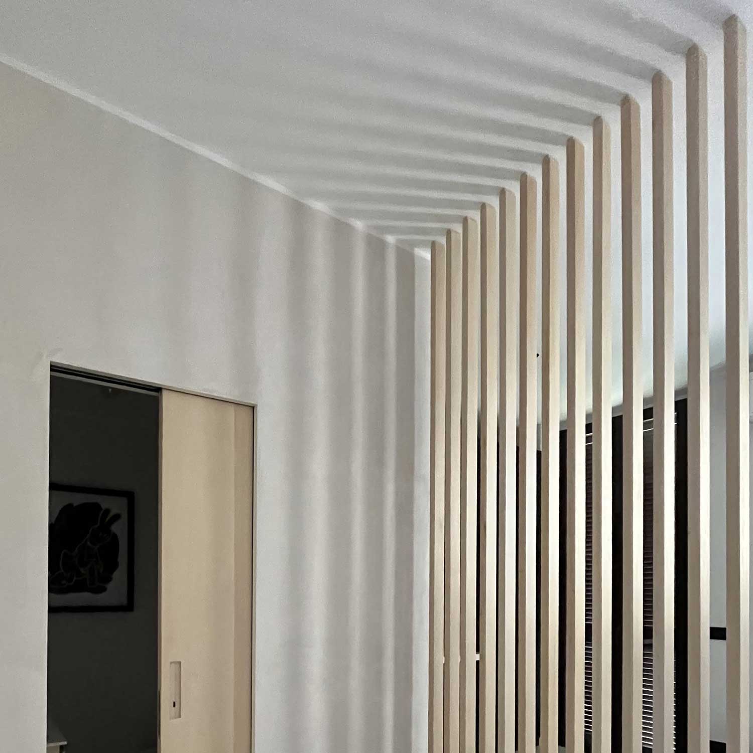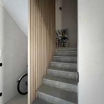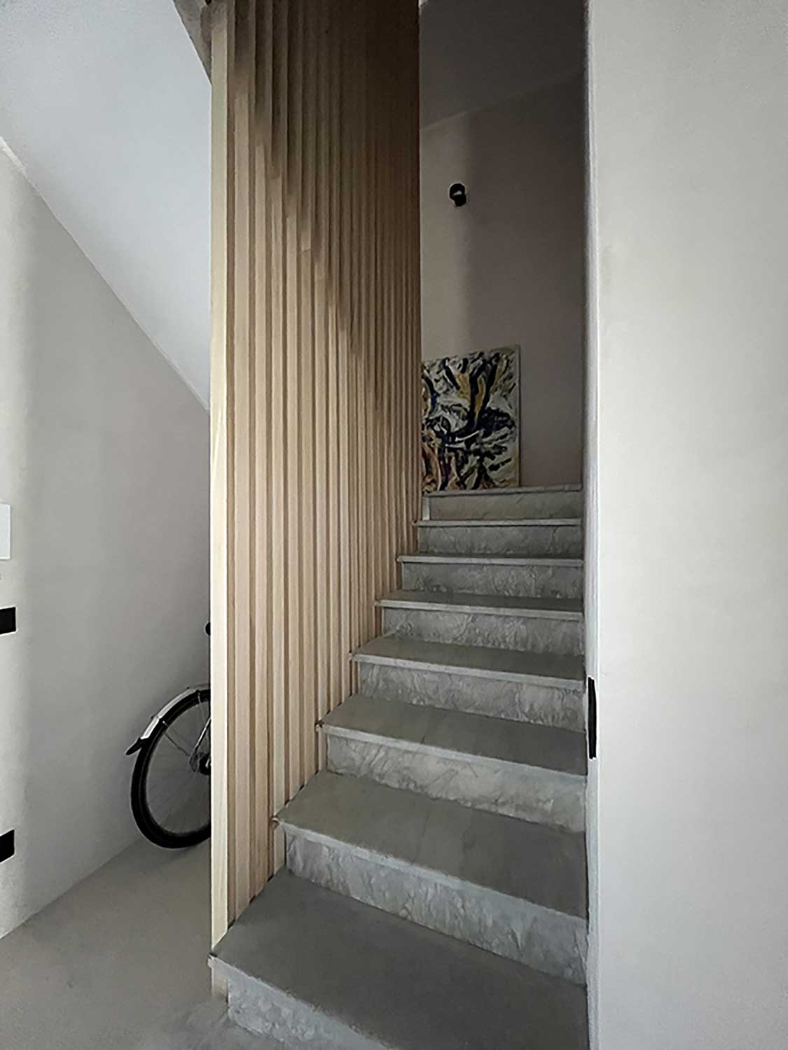– En la escalera, sin embargo, la actual barandilla metálica se sustituye por un sistema de listones aún de madera, que también velan parcialmente la zona de lavandería adyacente.