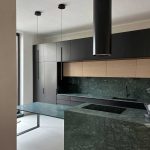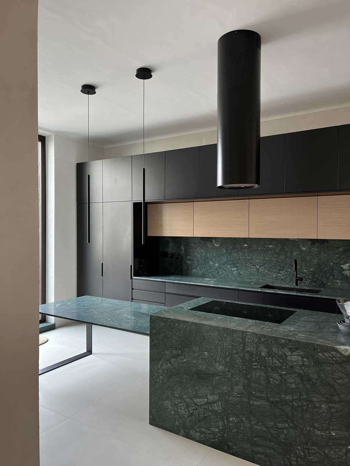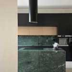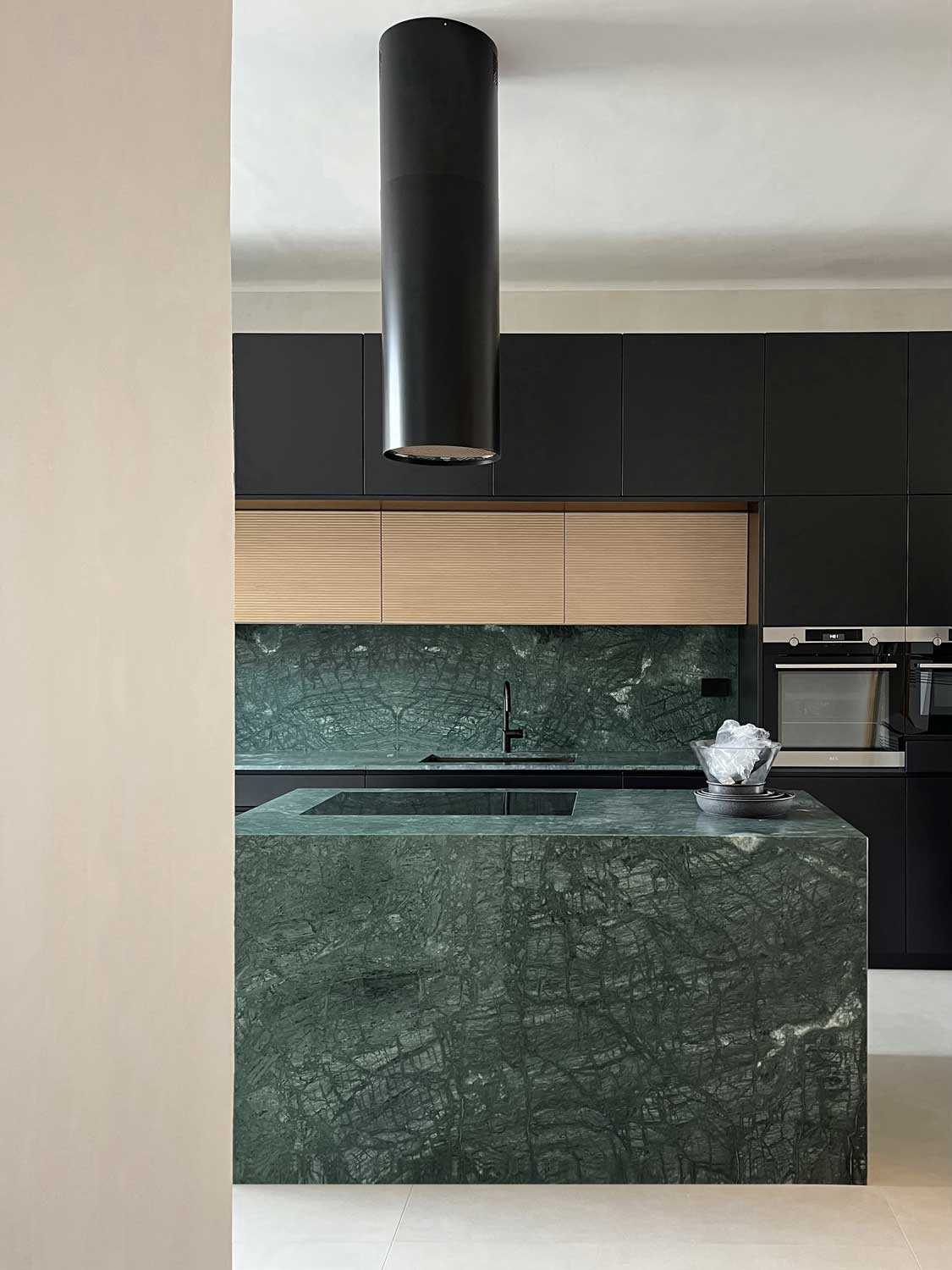 – En la cocina, el cambio parcial del acabado de los muebles, un nuevo pavimento con sabor a hormigón, pero sobre todo la adopción del mármol verde Guatemala para las encimeras y las verticales de la isla, diseñan la nueva paleta de la estancia.