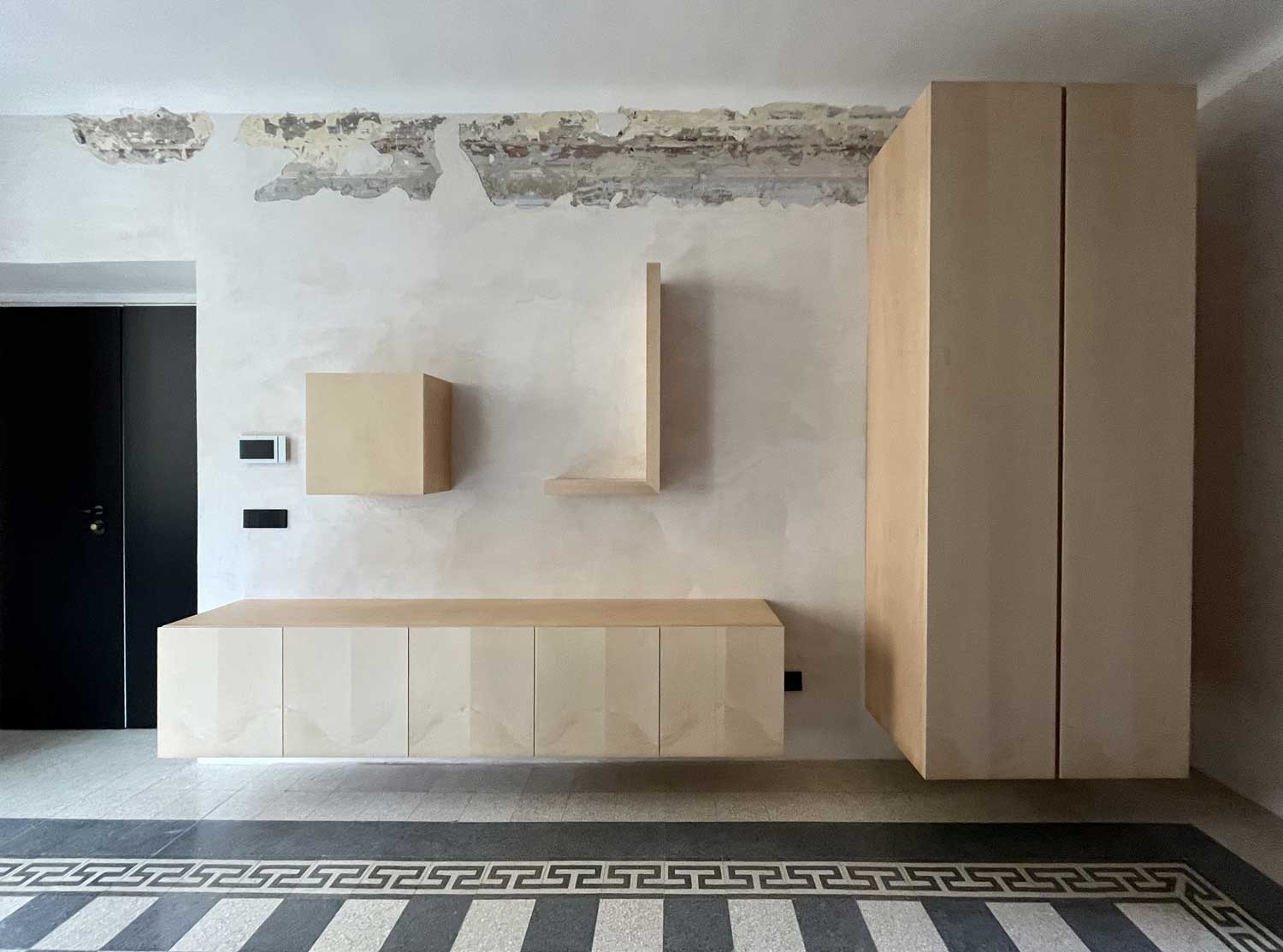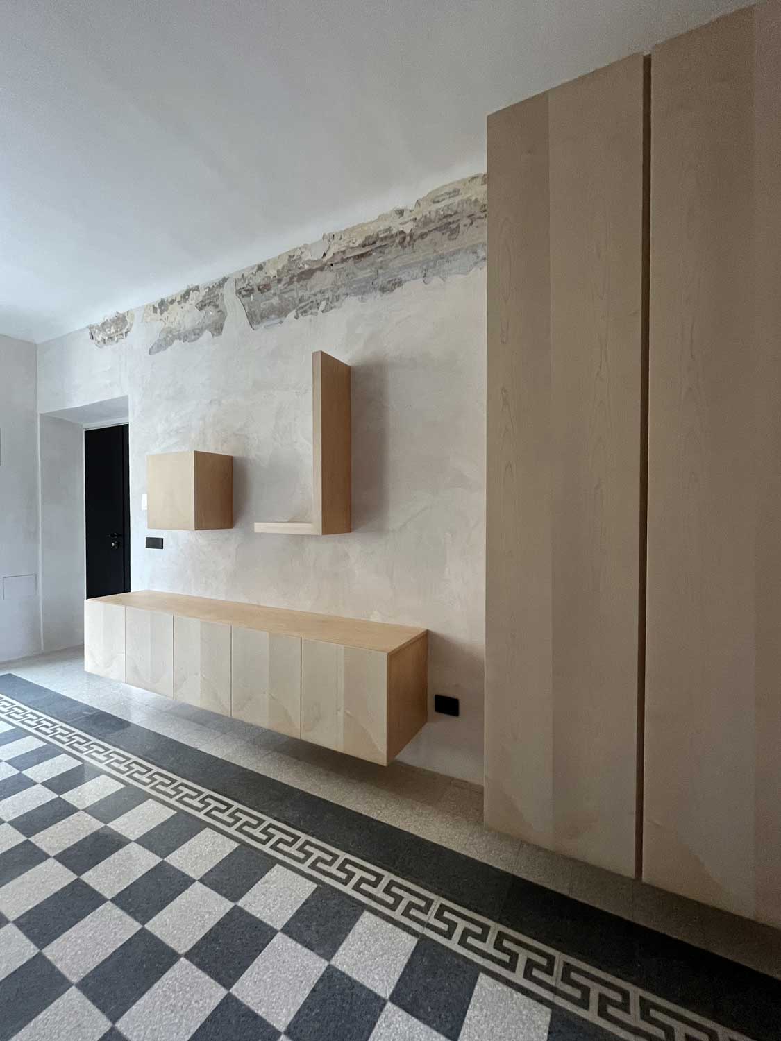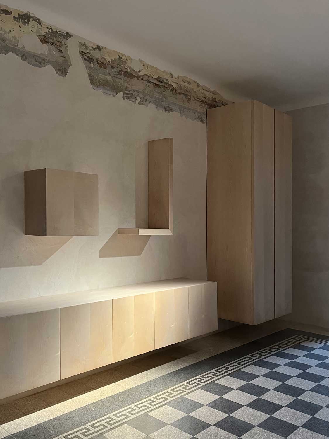 Pero es sobre todo en las partes del condominio donde el edificio comunica las características deseadas hoy por el cliente: las yeserías, las escaleras de piedra, las barandillas, las demás partes de madera, de hecho cuentan sin pudor todas sus arrugas, y es precisamente esto lo que se convierte en el punto de partida para la definición de la nueva paleta de materiales, sin duda a «desplazar» hacia sabores más cálidos y ásperos.