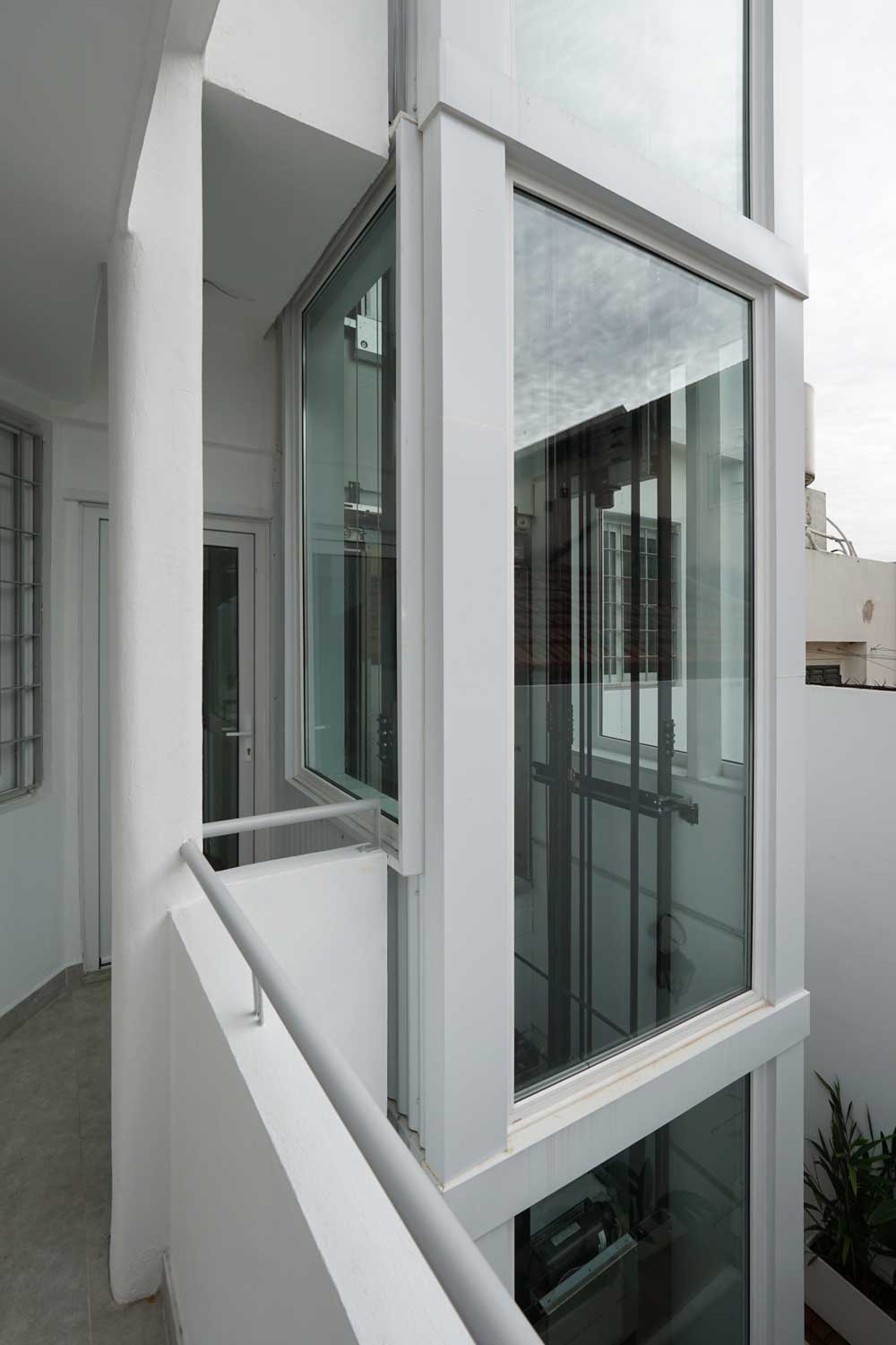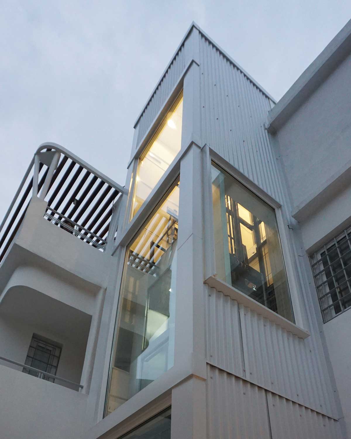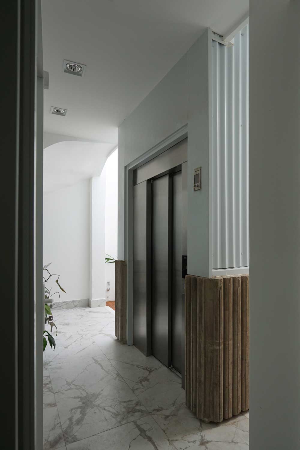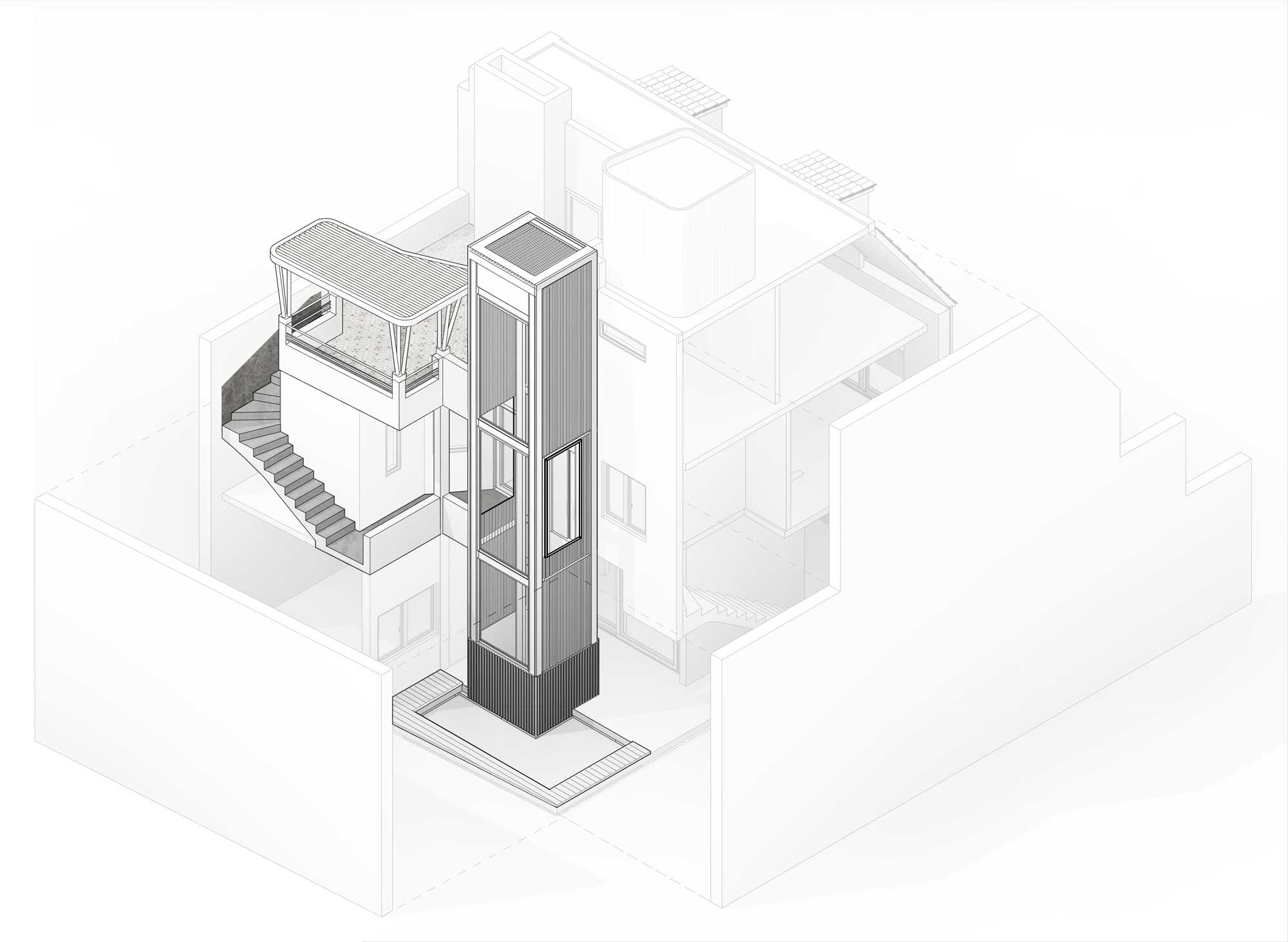 La vivienda preexistente, de tres plantas, presentaba limitaciones para usuarios con movilidad reducida. La solución adoptada por el estudio fue la incorporación de un ascensor de estructura metálica adosado a la construcción original, junto con una nueva escalera secundaria que permite un uso complementario del sistema de circulación vertical.