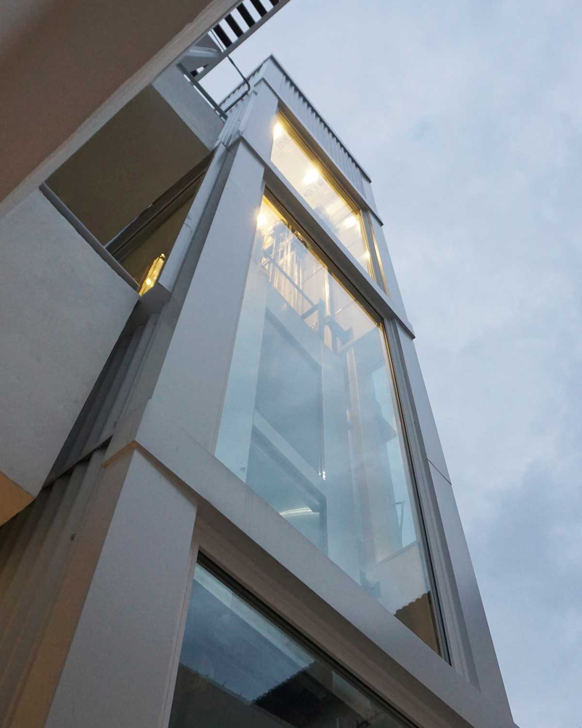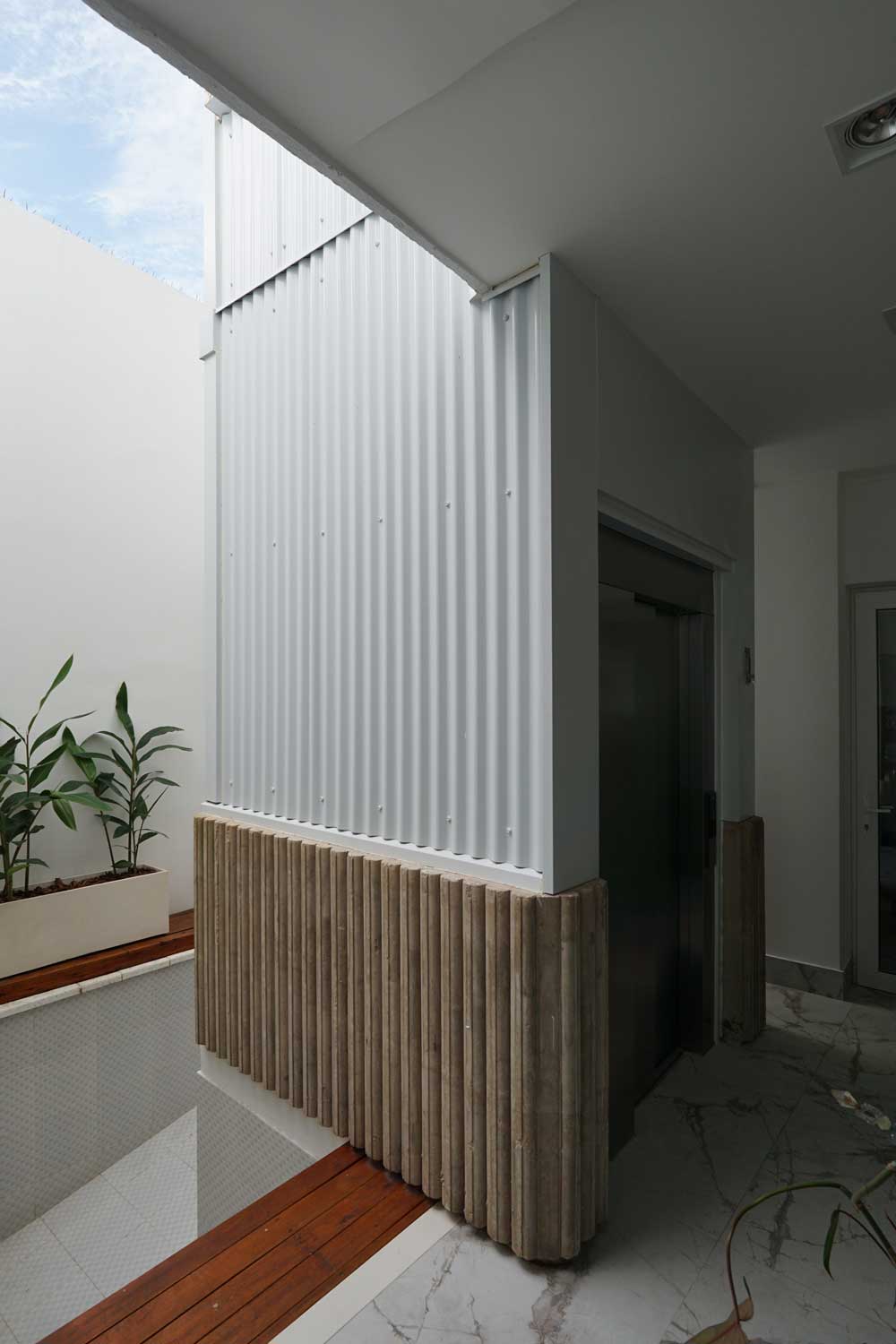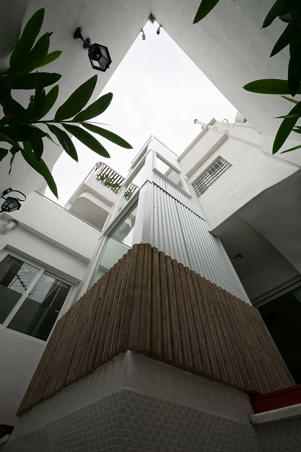 La vivienda preexistente, de tres plantas, presentaba limitaciones para usuarios con movilidad reducida. La solución adoptada por el estudio fue la incorporación de un ascensor de estructura metálica adosado a la construcción original, junto con una nueva escalera secundaria que permite un uso complementario del sistema de circulación vertical.
