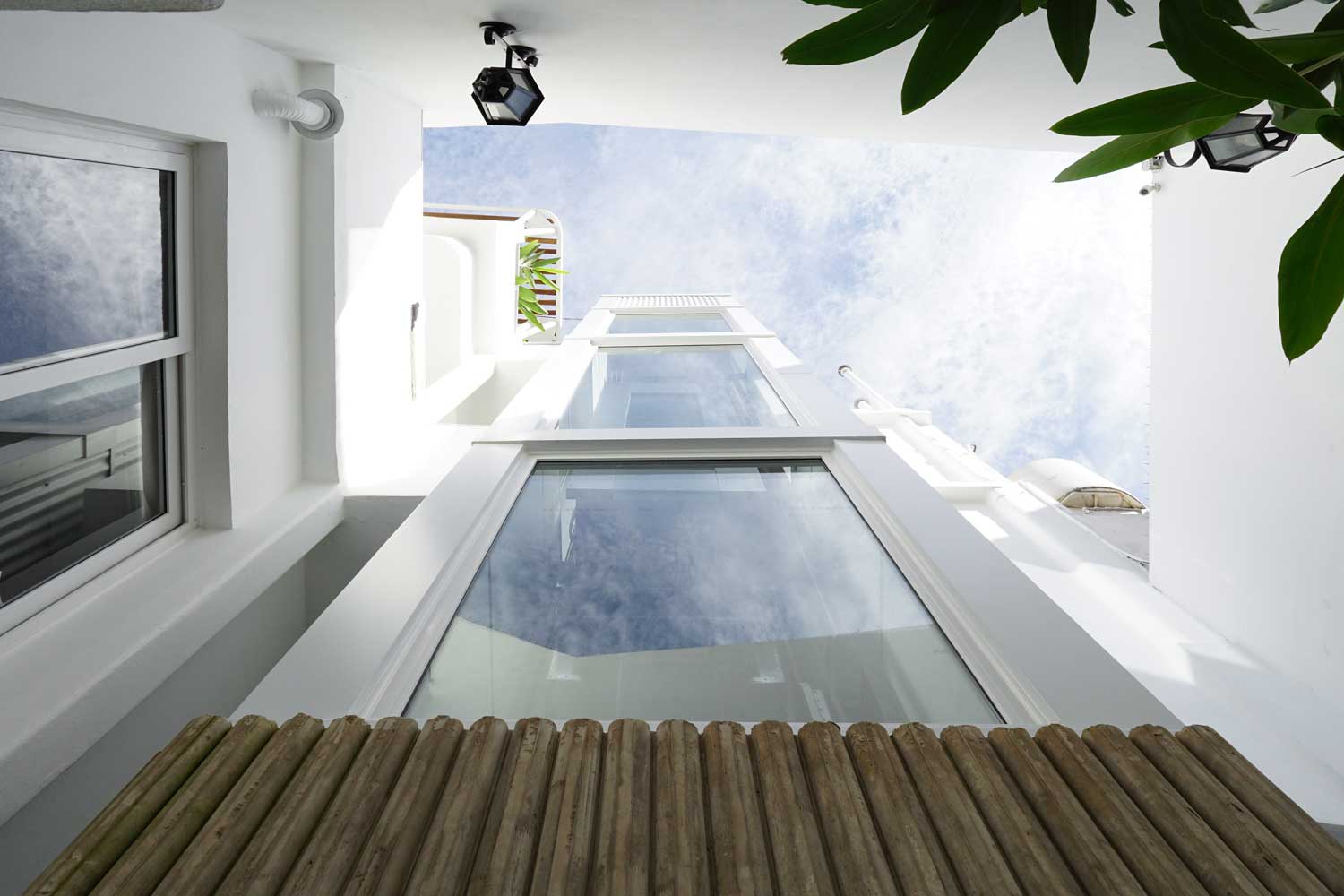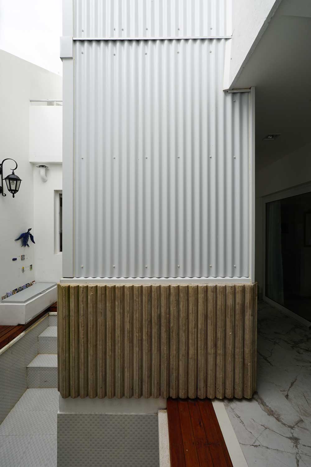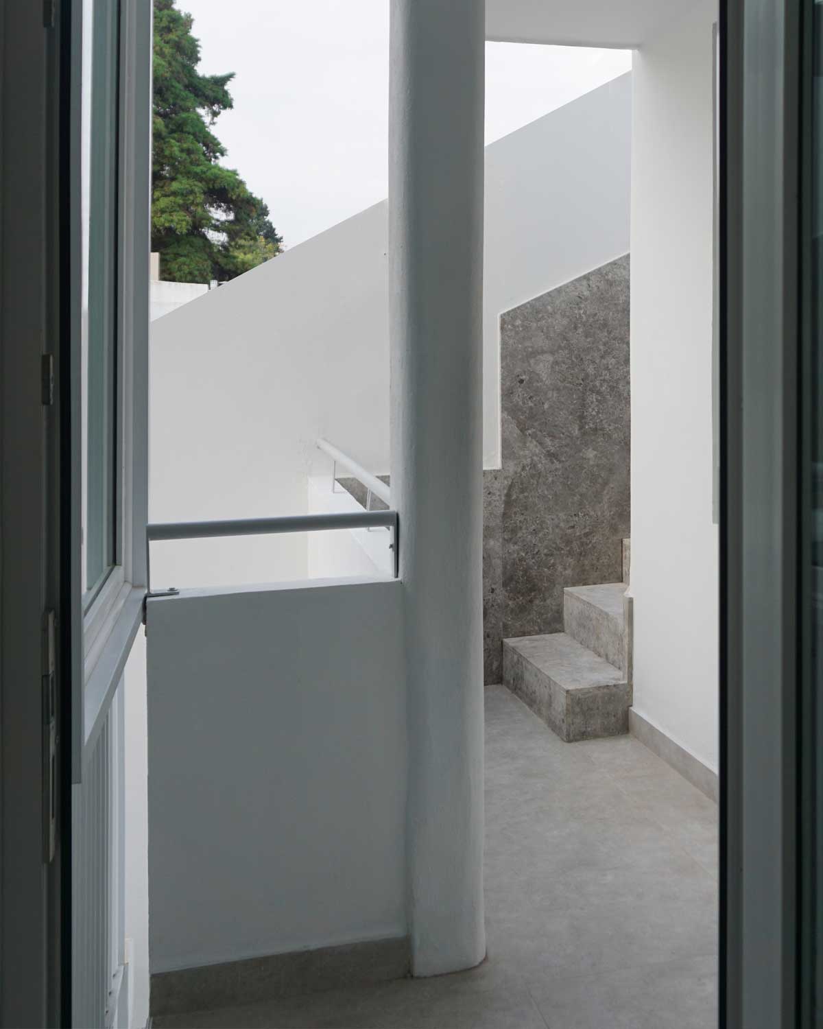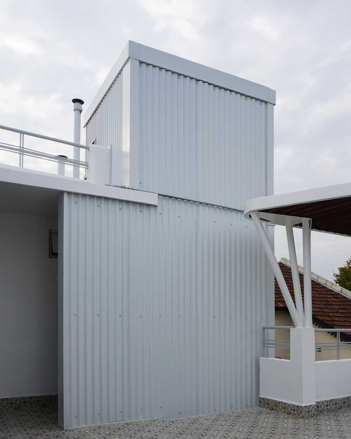 La vivienda preexistente, de tres plantas, presentaba limitaciones para usuarios con movilidad reducida. La solución adoptada por el estudio fue la incorporación de un ascensor de estructura metálica adosado a la construcción original, junto con una nueva escalera secundaria que permite un uso complementario del sistema de circulación vertical.