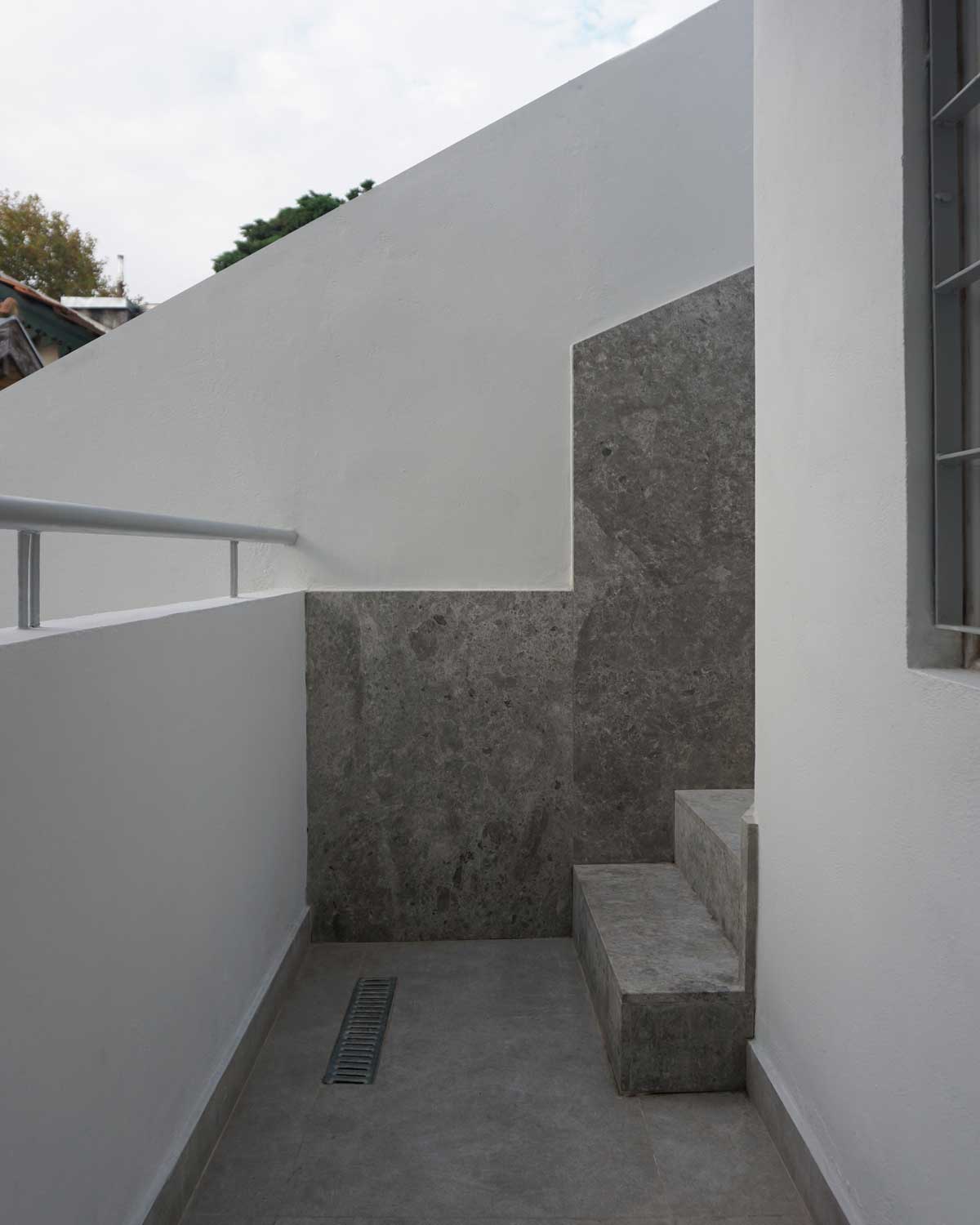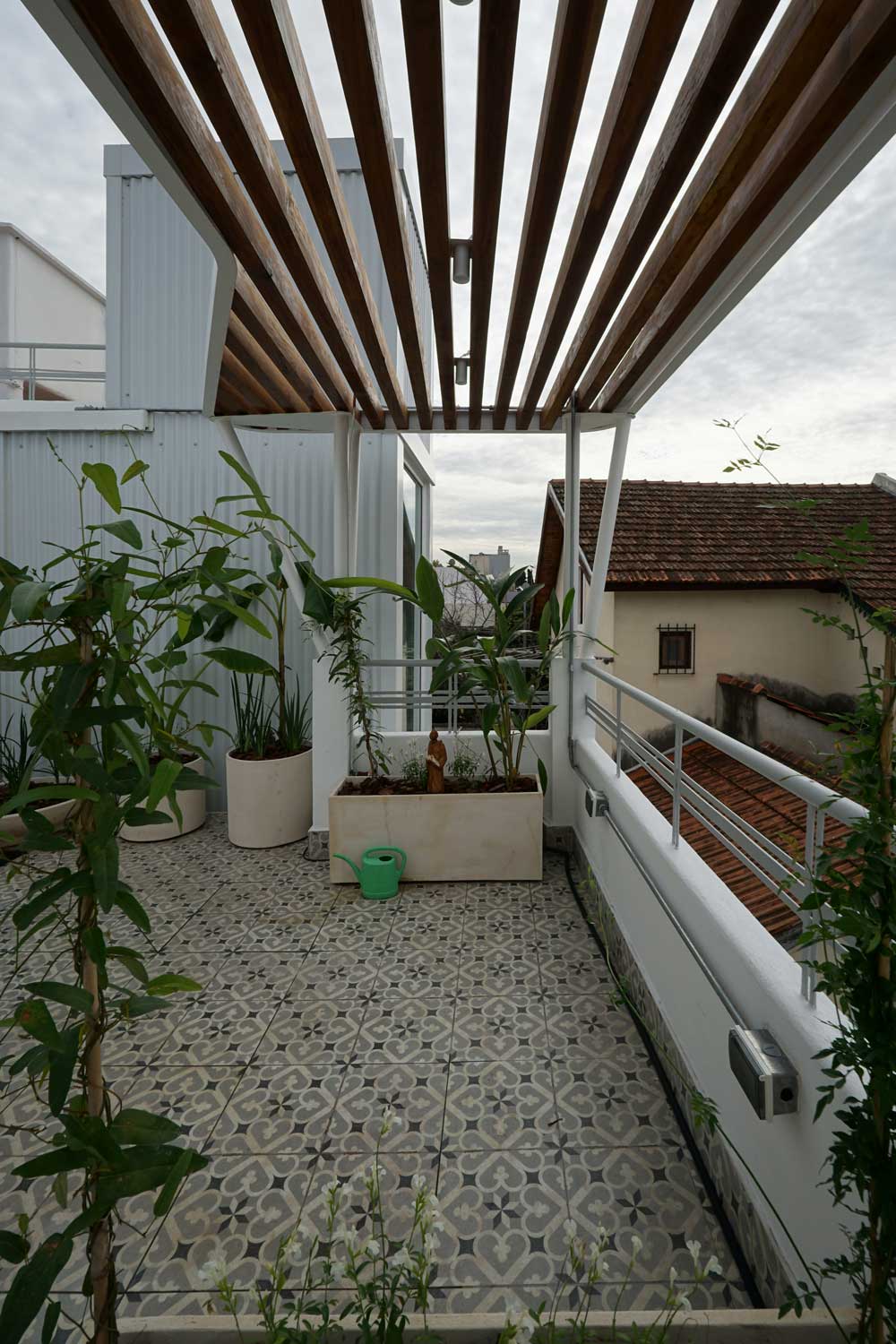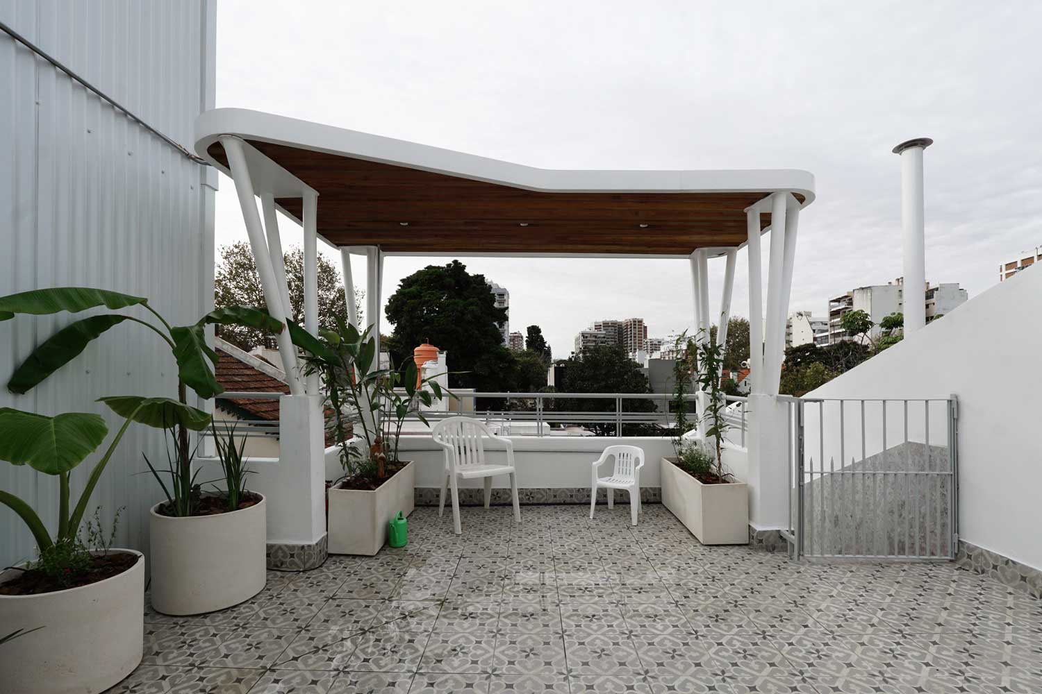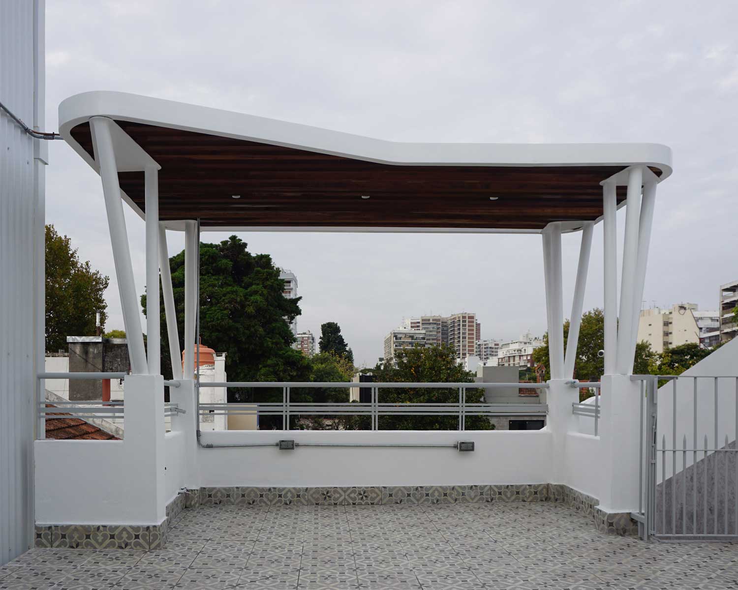 Como complemento al núcleo vertical, se proyectó una escalera secundaria que desemboca en la terraza. Allí se incorporó una pérgola metálica que actúa como espacio de transición y de sombra, posibilitando nuevos usos sociales y recreativos en el último nivel de la casa.
