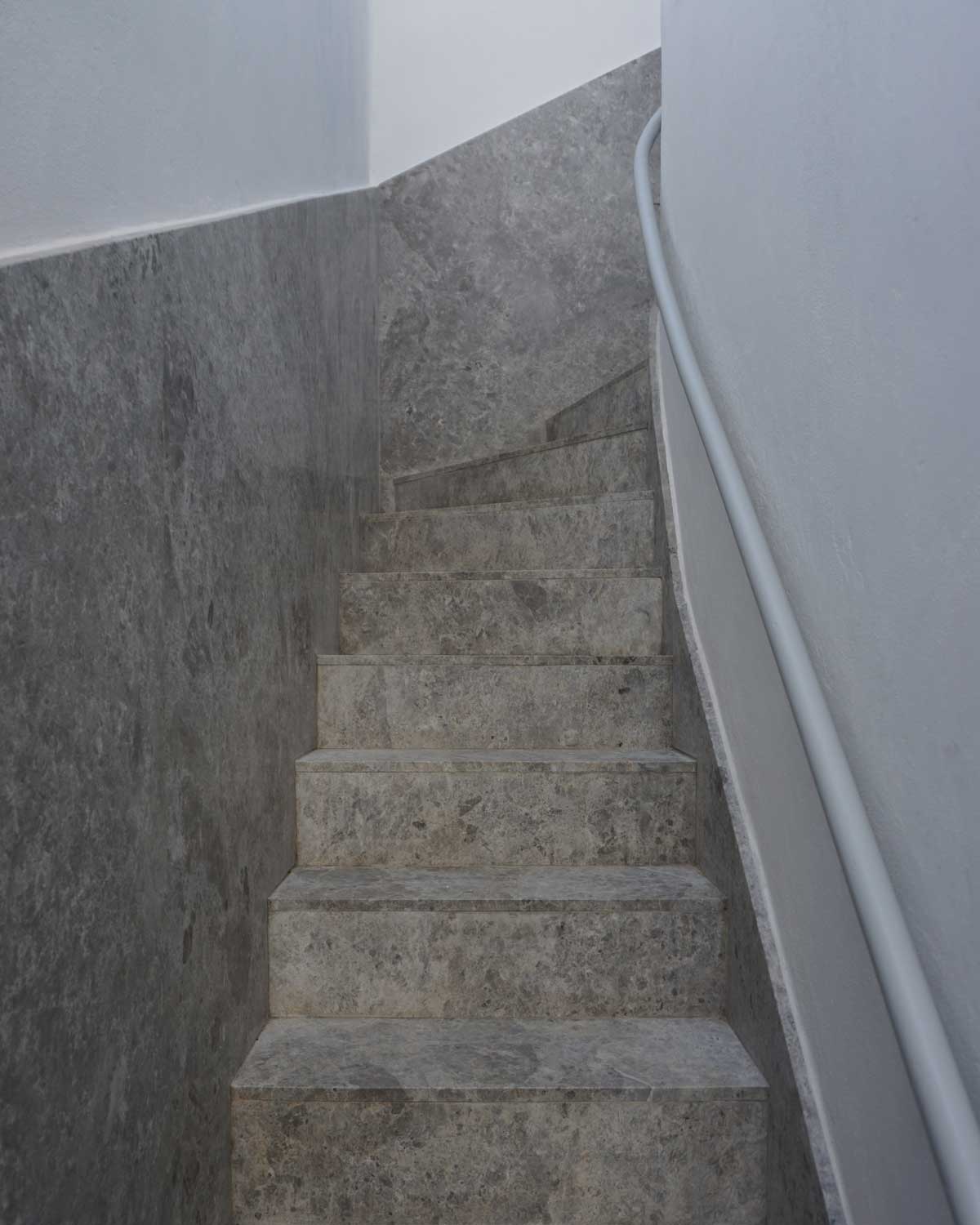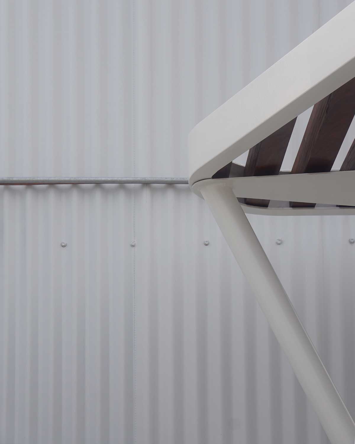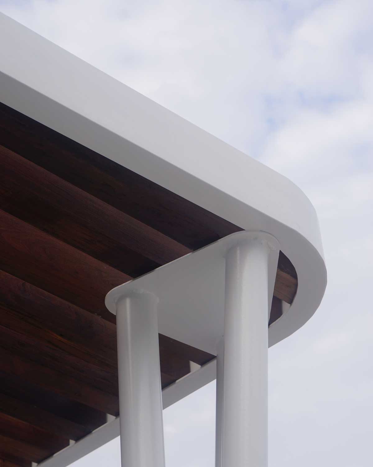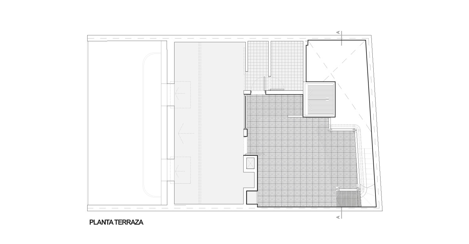 Como complemento al núcleo vertical, se proyectó una escalera secundaria que desemboca en la terraza. Allí se incorporó una pérgola metálica que actúa como espacio de transición y de sombra, posibilitando nuevos usos sociales y recreativos en el último nivel de la casa.