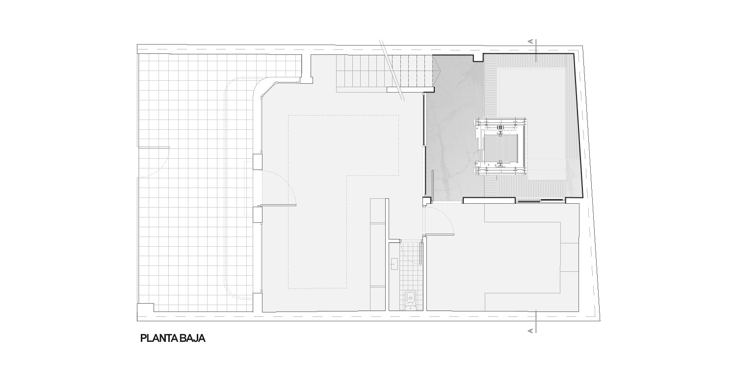 El emplazamiento del ascensor responde a varios criterios funcionales y espaciales. Se ubica contiguo al sector de la piscina, en el límite exterior de la vivienda, permitiendo su construcción sin interferir con las estructuras existentes y facilitando las conexiones programáticas entre los espacios exteriores e interiores. El núcleo se desarrolla a lo largo de los tres niveles, conectando el área social, los dormitorios y la terraza.