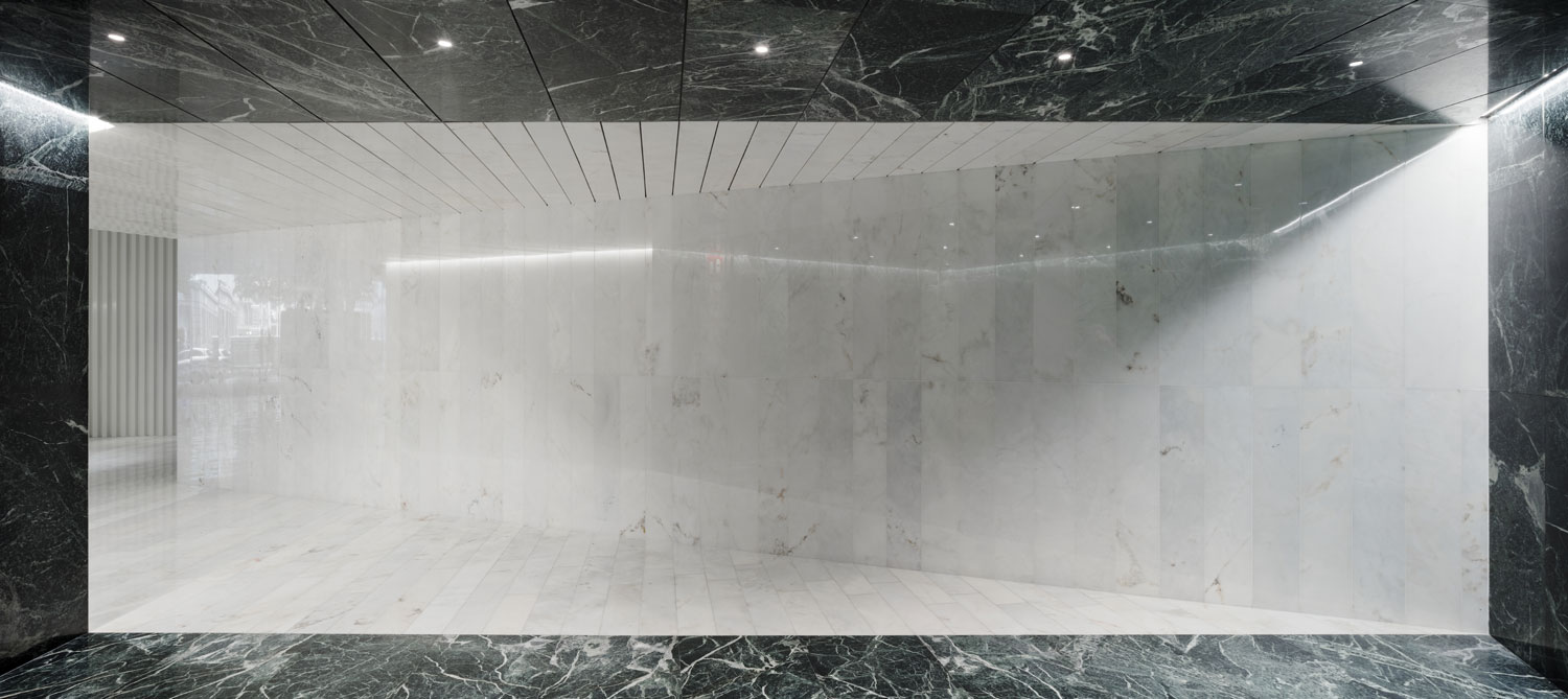 On the interior floor, white marble was installed, therefore, together with the white corrugated sheet a very bright interior space has been configured. Bush hammered granite has been used on the exterior floor, and together with the anodized aluminum, forms a gray ring that further enhances the interior white. The white marble of the floor, laid out following the rhythm and configuration of the frets, was also placed in the lower half of the reception panel, to form the furniture in this area and frame the access to the waiting room. Green marble is used in the waiting room, identical to the exterior pillars, both on the floor, walls and ceiling and which is accessed through a corridor with Estremoz white marble on the floor, walls and ceiling. The encounters have been taken to the corners and diagonals to generate different geometric and formal readings of the space. Lastly, there is the elevator core configured as a golden block formed by gold stainless steel panels, as a nod to the building that was the headquarters of one of the most important banks in Europe. On the contrary, the elevator lobbies of the rest of the floors have been configured as white boxes with perforated sheet metal with sound-absorbing sheets on the walls and a gray floor, made of micrograin terrazzo or self-leveling mortar.